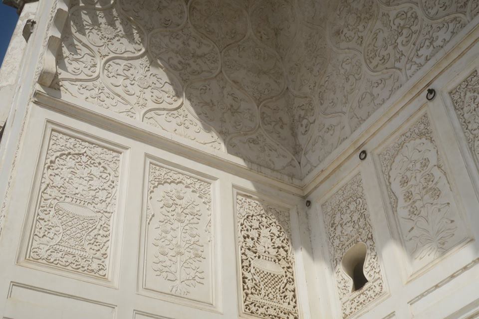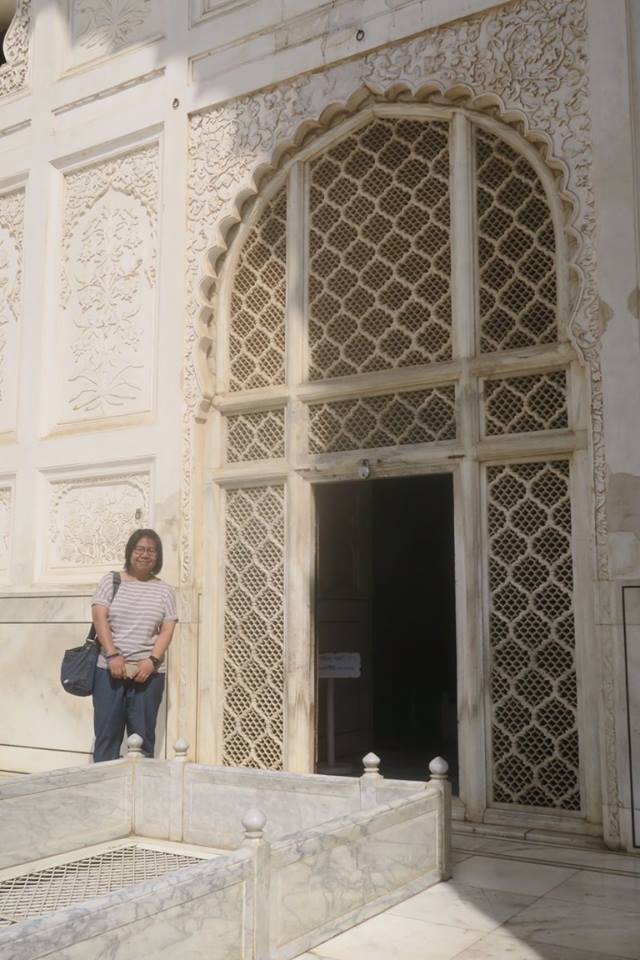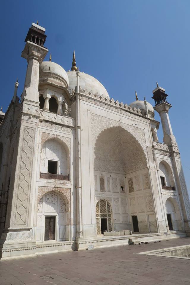 มีขนาดเล็กกว่า เพราะผู้สร้างมิใช่ "ชาห์" แต่ยังรักษาลักษณะสมมาตรไว้พร้อมมัสยิด เสาหอประกาศทั้งสี่ สูงกว่าต้นแบบ ส่วนข้างในใช้หินอ่อนเฉพาะชั้นฐานและบนยอดโดม นอกนั้นเป็นปูนฉาบ ทำรูปและลายไม่ด้อย แต่ก็ได้ไม่เท่า ส่วนที่ทำฝังหินสีนั้นไม่มีเลย ทำได้แต่เพียงแต้มสีวาดไว้เลา ๆ เท่านั้น