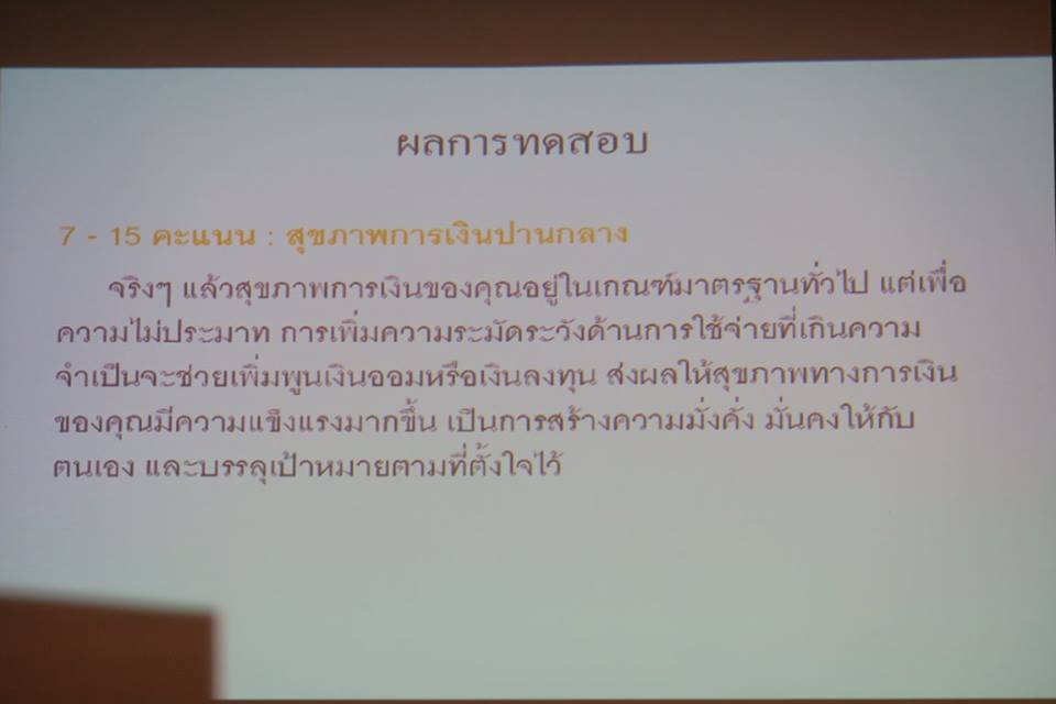 จากนั้นมีการเสนอ SMART GOALS แล้วทดสอบพิสัยทางการเงินการคลังกันด้วยแบบทดสอบ ๑๒ ช้อ ผลออกมา ๓ กลุ่ม คือ อ่อนแอ / ปานกลาง / ดีมาก ซึ่งทั้งหมดเกือบ ๓๐ คน อยู่ในเกณฑ์ดีมากไม่กี่คน จากนั้นจึงต่อด้วยรู้ออม รู้ใช้จ่าย รู้ลงทุน จนจบวันด้วยการทดลองออกแบบกับ ๒ กรณีนำร่อง น้องใหม่มาเริ่มงานอายุ ๒๔ ที่คาดหวังว่าจะอยู่ถึง ๘๐ ปี แต่แผ่นการออมและใช้สามารถสำรองใช้ได้เพียง ๗๒ ปีหมด กับอีกคู่สมรสวัย ๔๐ ที่คาดว่าจะอยู่ถึง ๘๐ ปรับแผนไปมาลงเอยที่ตายแล้วยังเหลือเงินพินัยกรรม-ทำศพอีก ๑ ล้านบาท