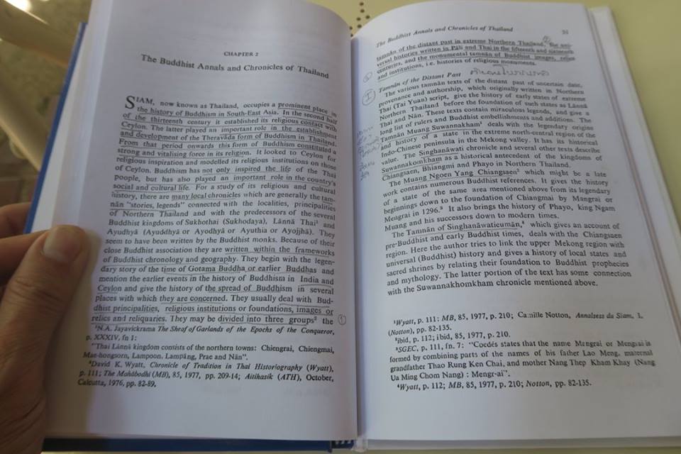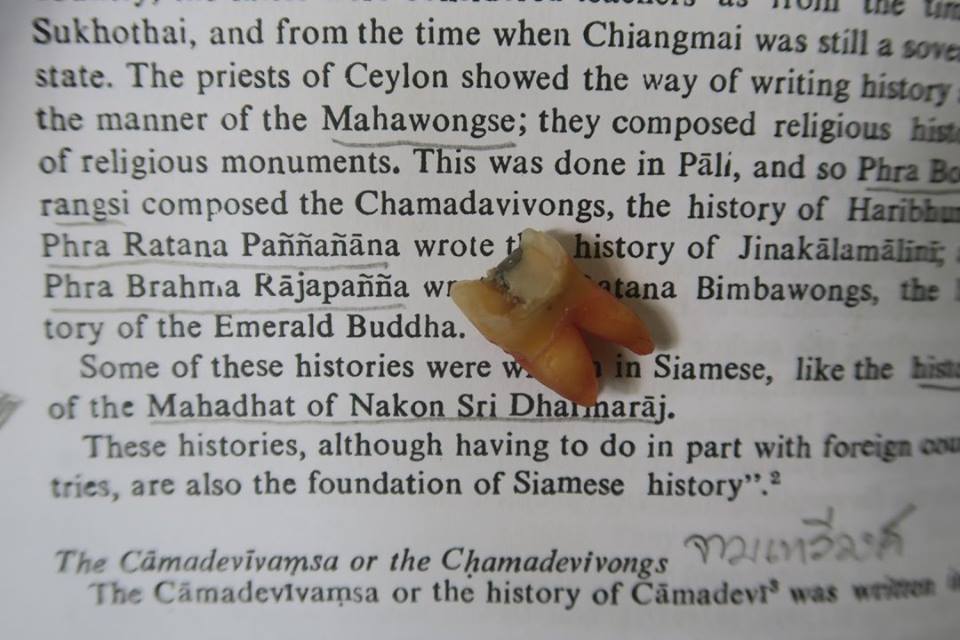 แต่ที่สนุกนัก คือตอนจะไปร้านหมอ ไม่รู้จะฉวยหนังสือไหนไปอ่าน เจอเล่มนี้ที่ว่าด้วยตำนานและพงศาวดารพระพุทธศาสนาในเอเชียอาคเนย์ ได้มาจากอินเดียนานแล้ว ปรากฏว่าของไทยไม่มีเรื่องตำนานพระทันตธาตุที่เมืองนครเลย จากที่แบ่งเป็น ๓ จำพวก คือ ตำนานทางเหนือ จักรวาลวิทยาบาลี และ ว่าด้วยพุทธสถาน แม้มีโผล่นิดหนึ่งเท่านั้น อย่างนี้.