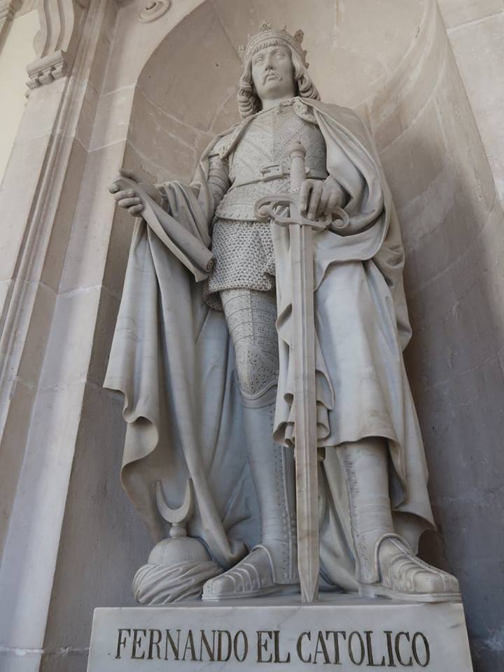 (bunchar.com 20180503_4) ตลอดทั้งพระบรมมหาราชวังแห่งนี้ที่ได้เดินดู และเขาห้ามถ่ายรูปทั้งนั้นั้น มีหลายสิ่งอย่างให้ได้ครุ่นคิด แต่เอาไว้กลับไปทบทวนมากกว่านี้ รวมทั้งไปคุ้ยดูกองเงินตราสเปนในกรุของคุณตา เพราะดูเหมือนว่า ทั้ง คาร์ลอส และ เฟอร์ดินานด์ คือรัชกาลที่เหรียญเหล่านี้ถูกขุดคุ้ยเอาเงินจากอเมริกา มาทำเหรียญออกค้าทั่วทั้งโลก อันต่อเนื่องจากการที่ราชินิอิซาเบลล่า กับ เฟอร์นานโด คู่นี้ ส่งโคลัมบัสไปหาอินเดียแล้วเจออเมริกา จนกลายเป็นเจ้าโลกแห่งแอตแลนติคและแปซิฟิค รวมทั้งการมายึดครองหมู่เกาะหนึ่งแล้วขนานนามตามชื่อพระเจ้าฟิลิป ว่า ฟิลิปปินส์ จนแม้ห้องที่พระเจ้าฮวน คาร์ลอส เพิ่งสละราชสมบัติ เมื่อปี ๒๐๑๔ นี้ มีจังหวะหนึ่งที่หน้าหอสวดประจำวัง ทำเป็นรูปของควีนอิซาเบลล่า กับ พระเจ้าเฟอร์นานโด้ ผู้เข้ารีตคาธอลิค เขาปล่อยให้ถ่ายรูปได้ ก็เลยเก็บเอามาเป็นเครื่องระลึกนิด ๆ ครับ เทียบกับอีก ๓ คู่ของพี่น้องผม วิเศษกันคนละอย่างขอรับ.