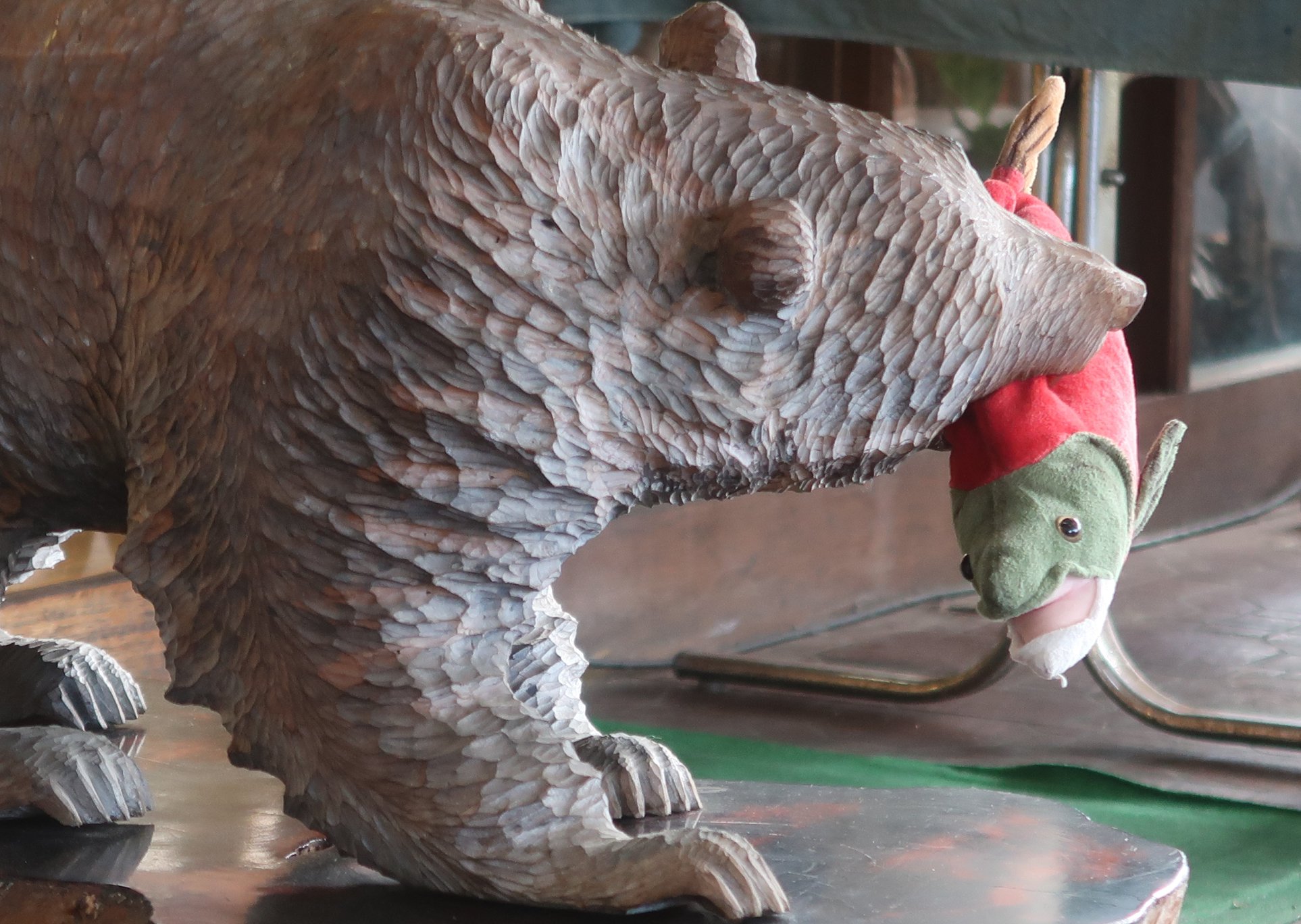 รวมทั้งเจ้าหมีน้อย ที่มายืนจับปลาเทร๊าท์โชว์อยู่หน้าปากประตู