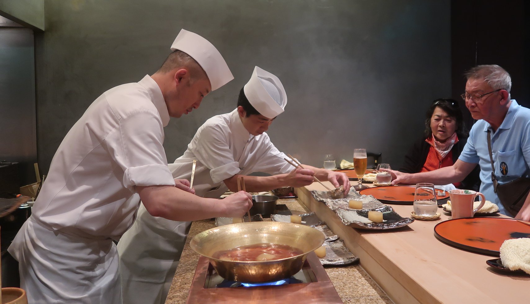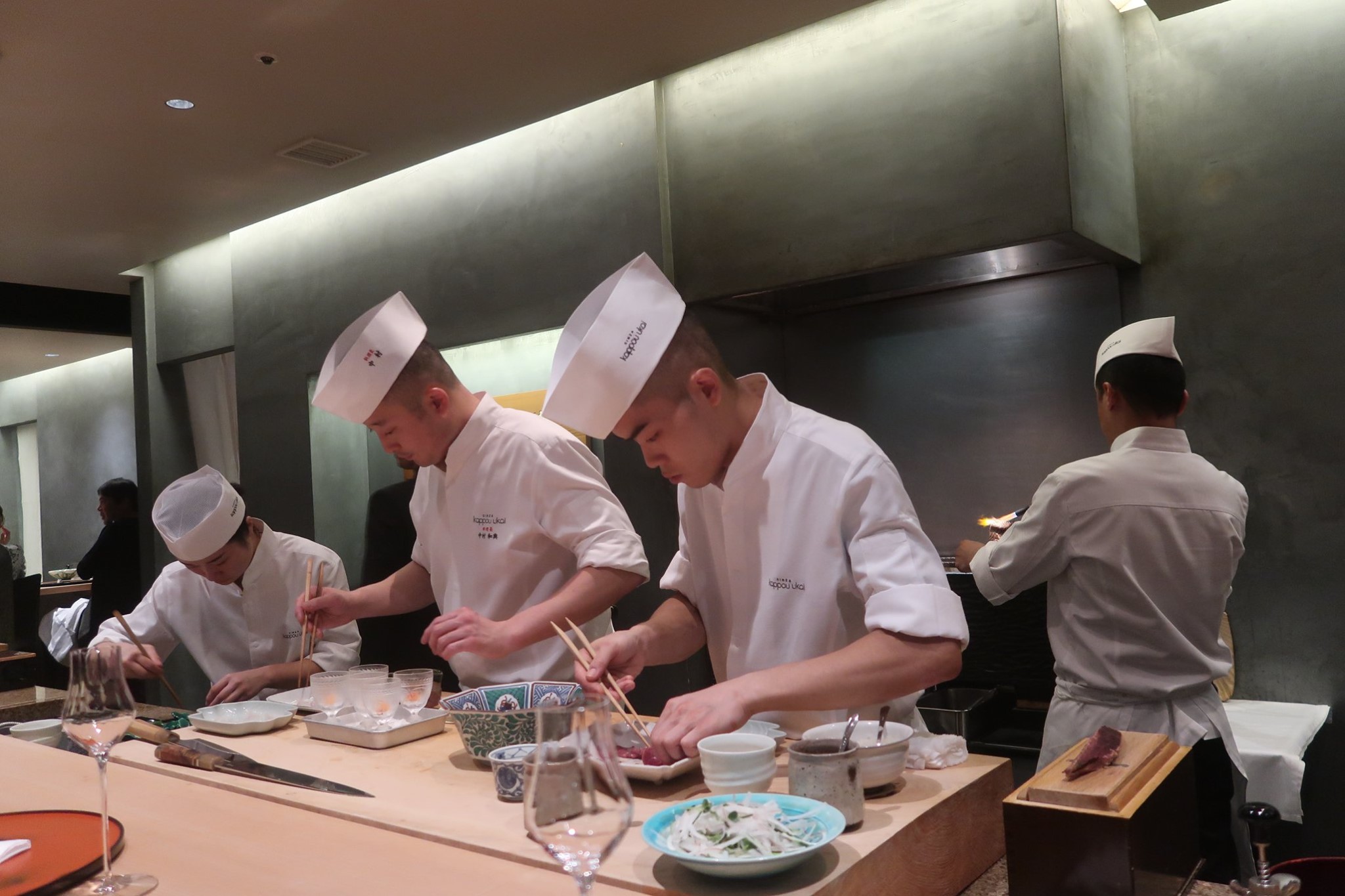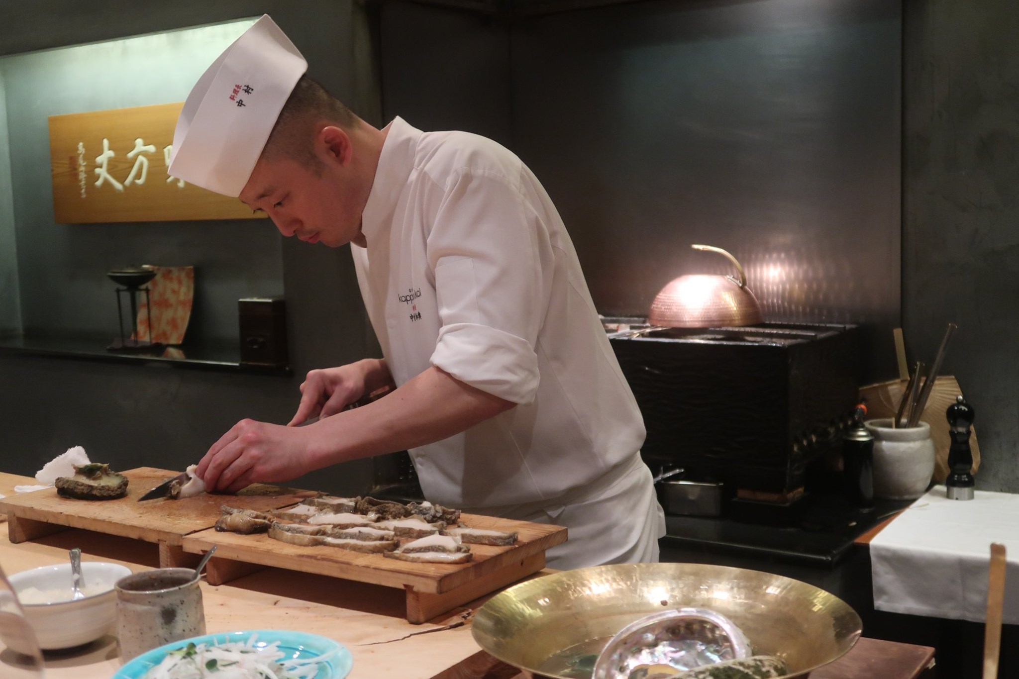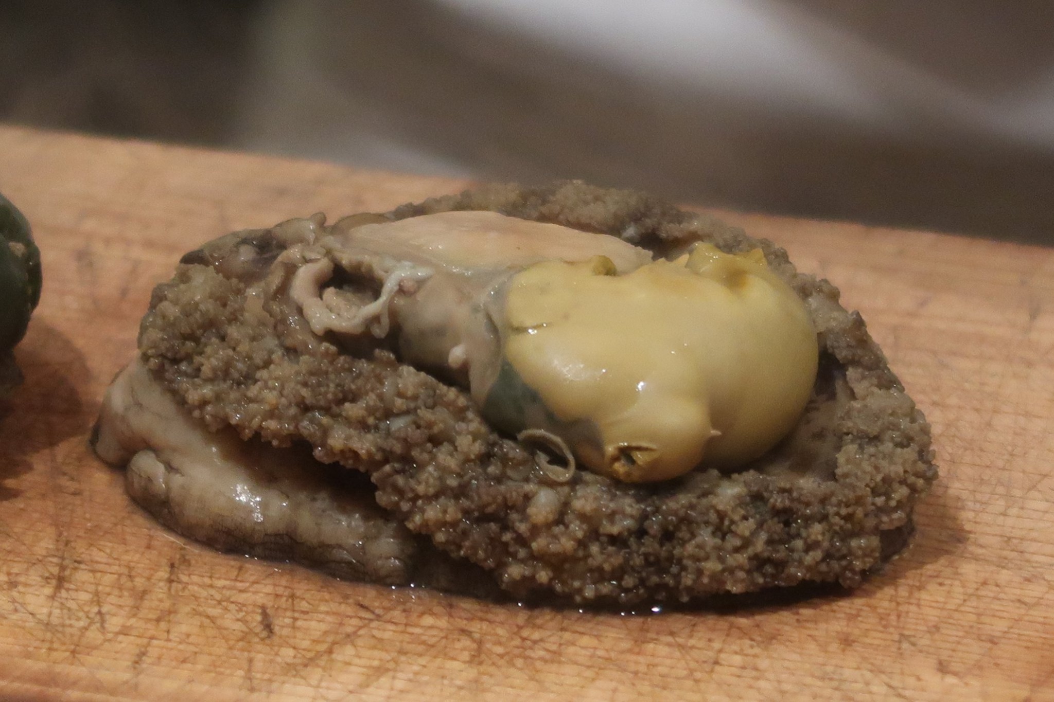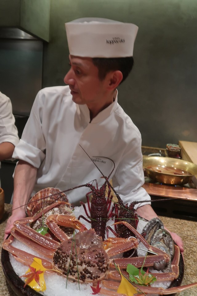 ถึงกรุงเทพนานแล้ว แต่ยุ่งหลายอย่างเพราะพรุ่งนี้มีงานแล้ว ๕ นัดเพิ่งเตรียมเสร็จไปส่วนหนึ่ง ง่วงแล้ว พรุ่งนี้ค่อยตื่นมาทำต่อพอดีมีคนทักมากว่าเที่ยวรอบนี้ดูเหมือนว่ากินกันหนักมากก็เลยนึกได้ว่ายังขาดอีกมื้อหนึ่งยังไม่ได้รายงานเป็นมื้อคืนฮาโลวีนที่กลับจากนิกโก้มานอนกินซ่าบรรยากาศเหมือนไปดูโชว์ ไมใช่โนะ หรือคาบูกิ แต่เป็นกุ๊กกลุ่มหนึ่งที่ใหญ่และคึกคักมากตลอดมื้อขนาดจานแรกสำหรับพวกเรา ๑๑ คนเป็นหอยเชลล์กับเป๋าฮื้อ เขาปรุงกันน่าสนุกอยู่ตั้งนานกินกันแปล๊บเดียวเองครับ