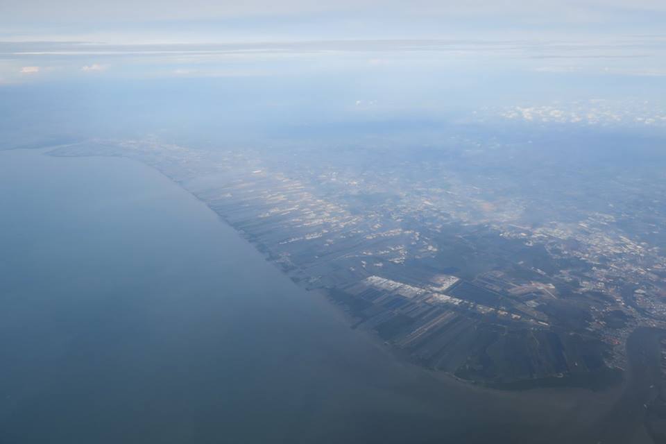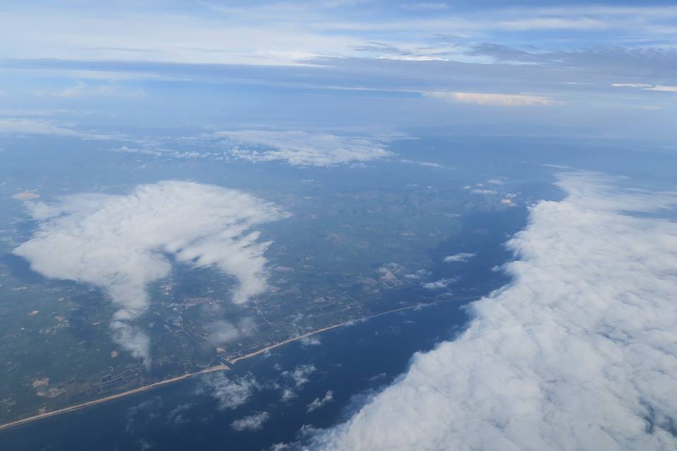 ตะกี้บินกลับมา กทม.ฟ้ากำลังสวย ไล่ขึ้นมาตั้งแต่สนามบินชุมพรที่ปะทิว ซึ่งเต็มไปด้วยสวนยางและปาล์มน้ำมัน ก่อนที่จะเห็นชายฝั่งทะเลชุมพรตอนบนที่ต่อกับประจวบฯ โดยมีเมฆไล่เข้ามา ไกลออกไปไม่เห็นอีกฟากฝั่งของคอคอดกระ และ แดนพม่าที่มีเทือกเขากั้นอยู่ จนถึงอ่าวประจวบ จึงเห็นเส้นทางพุ่งตรงสู่ด่านสิงขรที่ซอกเขา ต่อด้วยเขาสามร้อยยอดที่ริมทะเลแล้วเมฆมาก ผมเองก็เพลินอ่านหนังสือผ่านปราณ หัวหิน ชะอำ เพชร จนดูอีกที ถึงปากน้ำท่าจีน เห็นปากน้ำแม่กลองอยู่ลิบ ๆ แล้ว