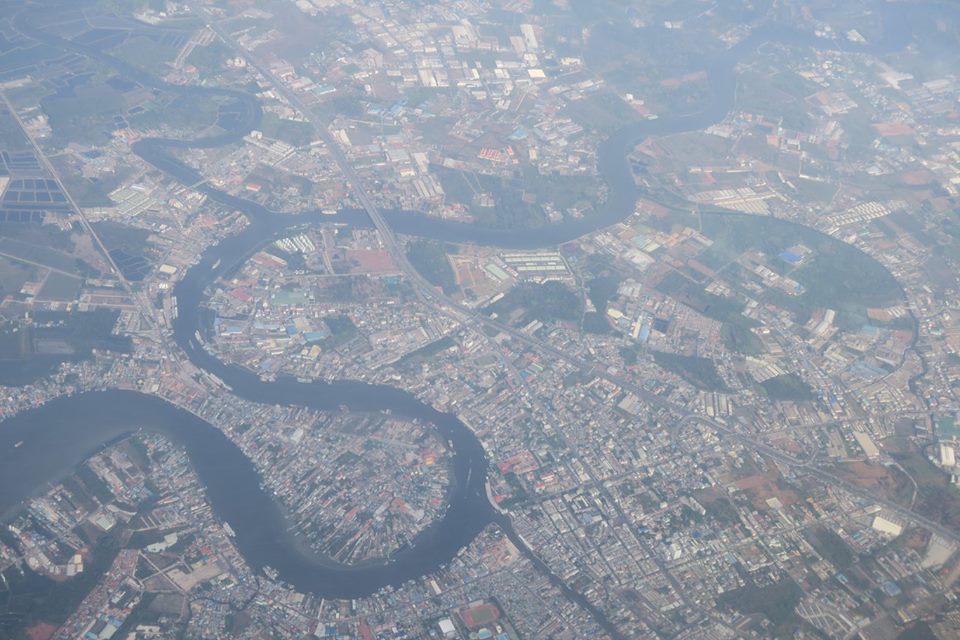 เครื่องบินเลียบน้ำท่าจีนที่คดเคี้ยวขึ้นไปเรื่อย ๆ ยังกะจะไปให้ถึงจินหลินที่ถูกฟูนันตีเป็นที่สุดท้าย แล้วเครื่องก็เลี้ยวให้ดูพุทธมณฑลเต็ม ๆ โดยไม่เห็นพระปฐมเจดีย์ รวมทั้งจานบินธรรมกาย แต่เห็นสถานีรถไฟฟ้าบางบัวทองกับ ๒ ห้างยักษ์ที่มาตั้งขายวัสดุก่อสร้างกลางทุ่ง ก่อนที่จะข้ามโค้งเจ้าพระยา มาข้ามหลายสายถนนและทางรถไฟ สู่วิภาวดีรังสิต ทุ่งและคลองรังสิตที่เต็มไปด้วยบ้านและรถกำลังติดต่อเนื่องมาจากฝนตกหนัก