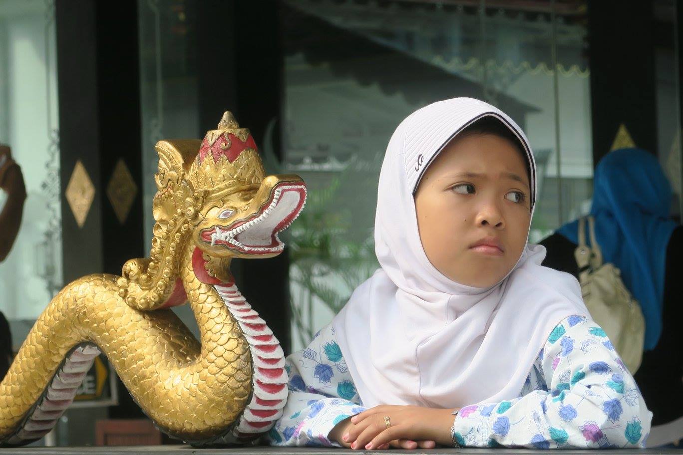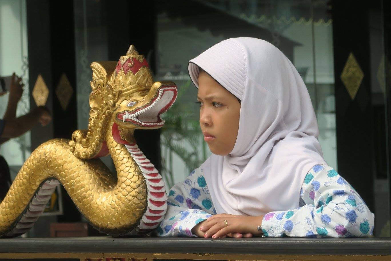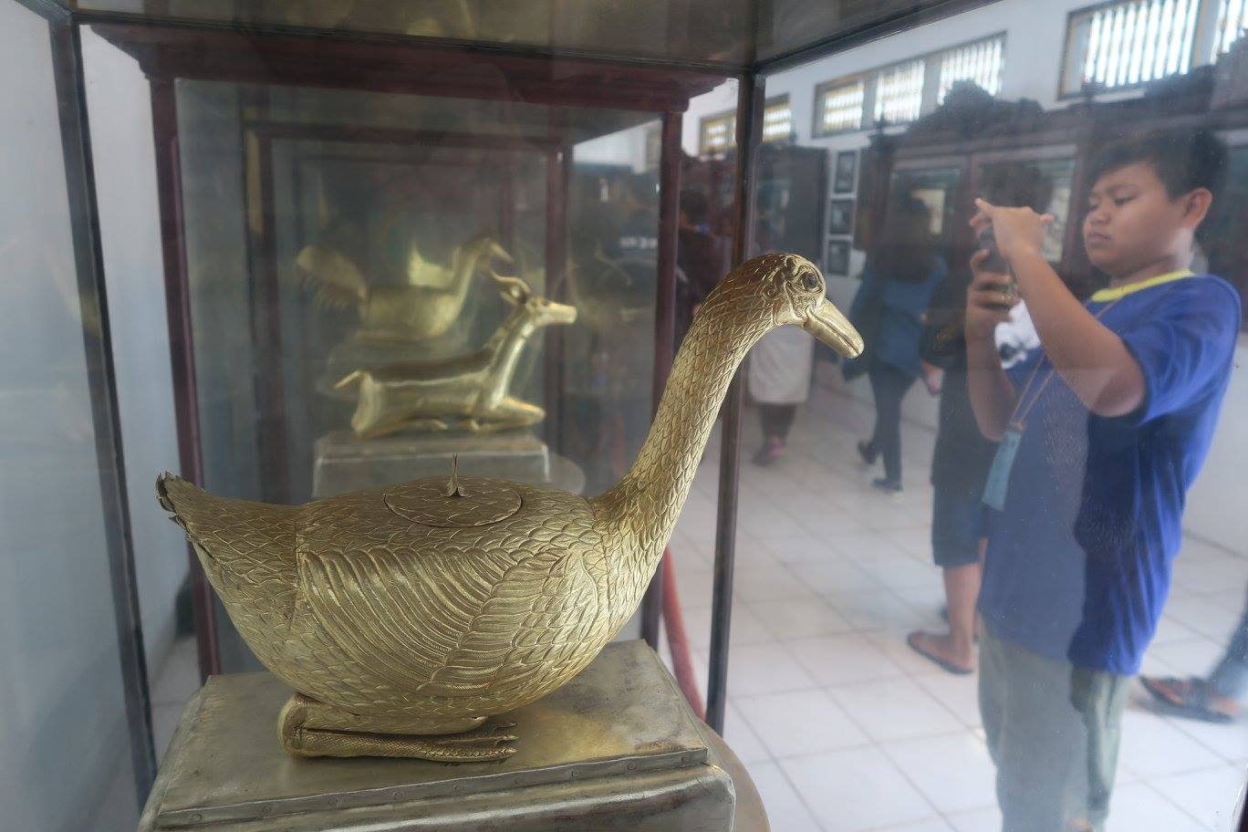 ตอนที่เข้าไปนั้น มีคณะต่าง ๆ เข้ามากันมาก ทั้งเทศและอินโด มากันเป็นครอบครัวก็มี เป็นโรงเรียนก็มาก เด็กน้อยคนนี้พ่อแม่กำลังถ่ายรูปให้ ในขณะที่หนุ่มน้อยคนหนึ่ง ดูว่าตั้งใจเลือกถ่ายรูปอะไร ๆ คล้าย ๆ กับที่ผมกำลังทำ โดยเฉพาะเครื่งราชกกุธภัณฑ์จำลองทองเหลืองทั้งชุด
