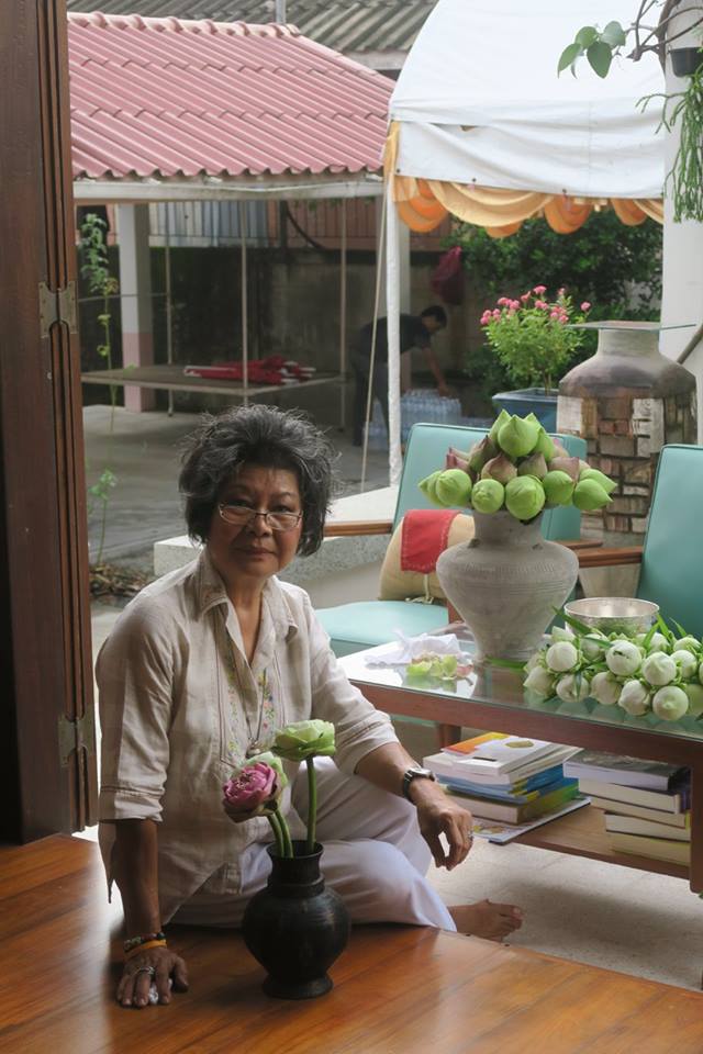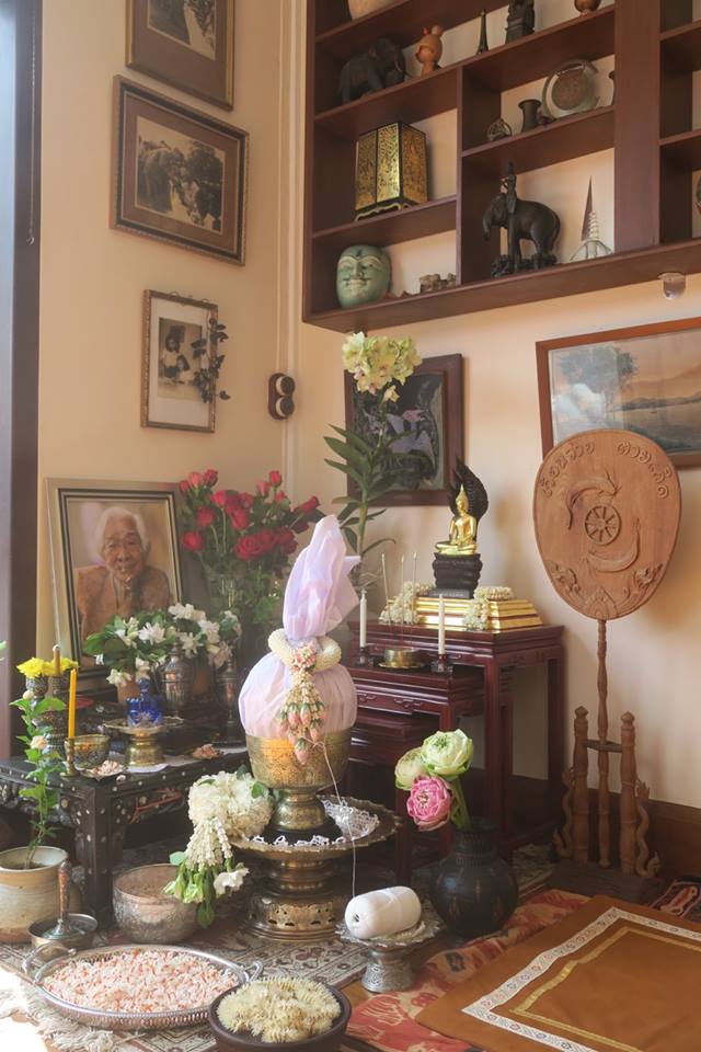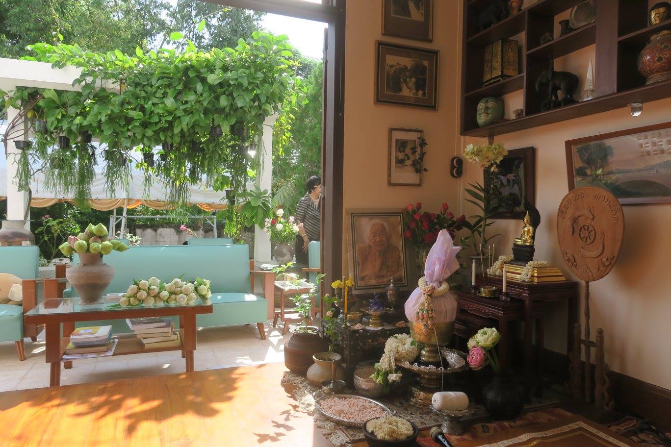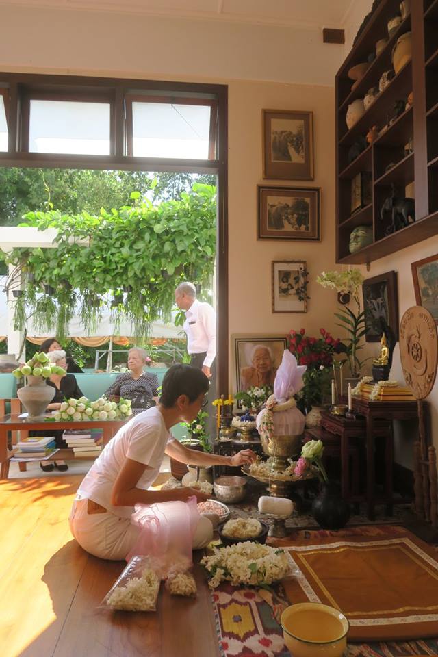 แม่ครับ เมื่อเช้าวันที่ ๒๔ พวกเราตื่นกันแต่เช้า พี่ ๆ ผู้หญิงก็ช่วยกันจัดดอกไม้ให้แม่กัน เต้ยขอพี่ตุ๊กตาเก็บดอกกรรณิการ์ที่เต้ยเอาผ้าปูรองไว้ใต้โคนตั้งแต่เมื่อคืน เพื่อเอามาให้แม่ โดยรุ่งนั้นเอาดอกปีบมาถักเป็นมาลัยได้หลายวง แถมมีคนเก็บพิกุลร้อยเป็นมาลัยเอามาส่งถึงบ้าน หอมกรุ่นไปทั้งห้อง ส่วนกุหลาบก็ได้พี่จุ๋มกับใครต่อใครช่วยกันใส่แจกันเดิม ๆ ที่แม่ก็เคยใช้จัดแต่งบ้านบ้าง ไหว้พระบ้างไงครับ พอพี่ตั้วกับพี่หงิดแล้วก็จั๋งกับตุ๋มเชิญโกศอัฐิของแม่และพ่อกับพี่เติบมาพร้อมกับอังคารของแม่ พี่หงิดก็เอามาลัยดอกพุดซ้อนที่เตรียมมากับที่เป็นดอกเอามาจัดใส่ถ้วยไม้ไผ่ของพ่อเติมให้หอมขึ้นอีก