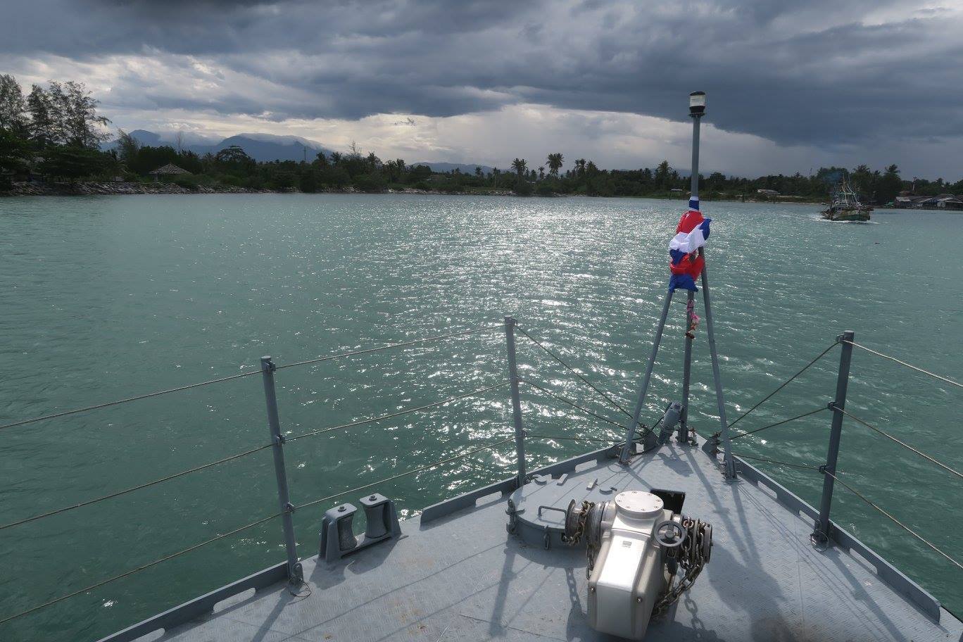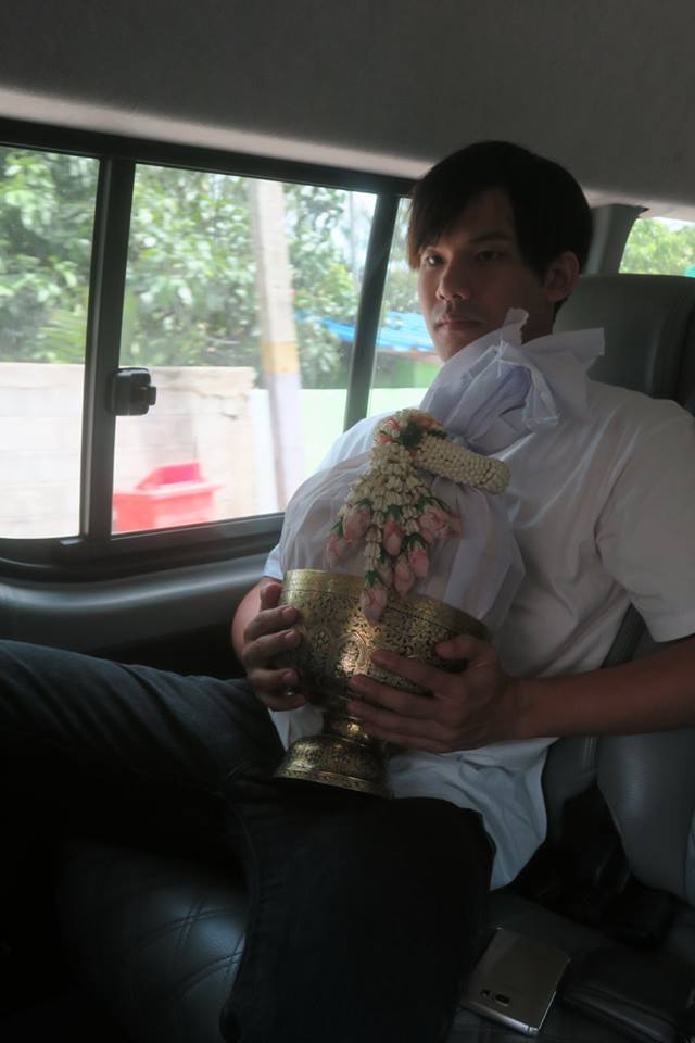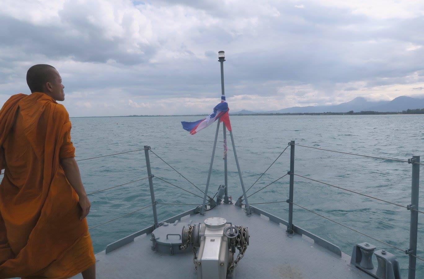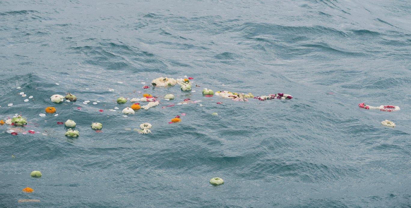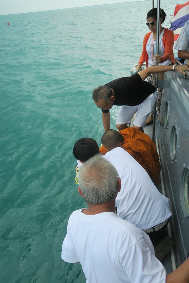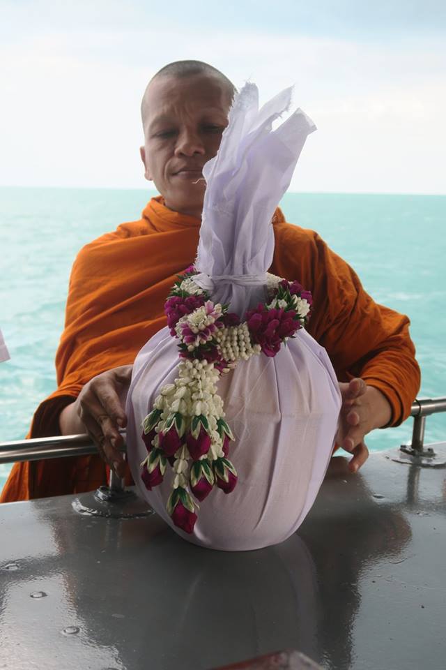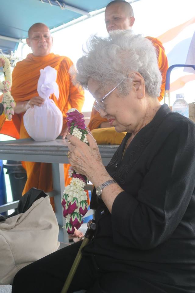เราไปลงเรือที่ท่าแพปูเลยศาลาน้ำที่เป็นบ้านยายผ่องตาผาดไม่มาก จากนั้นก็ตรงออกปากคลองท่าสูงจนพ้นประภาคารและทุ่นแล้วอ้อมไปถึงหน้าสวนท่าสูงที่แม่กับพ่อ คุณตา น้าพา พาเรามาเล่นน้ำกันเรื่อย ๆ โดยมีท่านเจ้าคุณวัดศรีทวีฯ นำภาวนาตั้งจิตส่งแม่แล้วมอบท่านพระครูเหมเจติยาภิบาล ผู้ได้ชื่อว่าเป็นผู็อภิบาลพระธาตุยอดทองของเมืองนคร เป็นผู้วางโถเถ้าอังคารของแม่ลงสู่พื้นทะเล โดยมีพี่โต พี่ตั้ว กับ นายตุ๋มทำหน้าที่แทนพวกเราทุกคนครับ จากนั้นนานาดอกไม้ที่พวกเราทุกคนแบ่งปันกันไว้ก็โปรยปรายตามแม่ลงสู่พื้นน้ำให้ได้หมายตาว่าแม่คืนสู่ธรรมชาติสิ้นเชิงแล้ว ณ บริเวณนั้น ขณะที่เรือก็วนรอบเพื่อทำปัจฉิมสักการะแก่แม่ ภายใต้ธงไตรรงค์ที่โบกสะพัด เป็นยอดเขาหลวงและมหาชัยบนฝั่งกลางหมู่เมฆทะมึนจนตรึงใจทุกถ้วนคนบนเรือที่มาส่งแม่