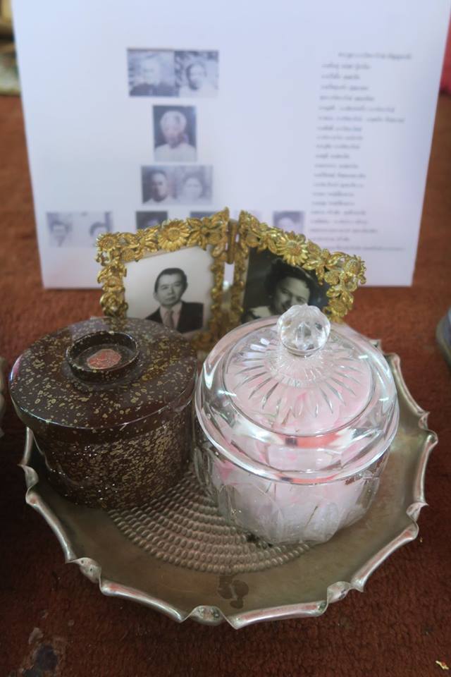 โกศถมของคุณทวด คุณตา คุณยาย ลุงสิทธิ์ ที่พี่ตุ่มเก็บรักษาไว้ พี่ติ๋มเป็นคนเอามา ส่วนของพ่อ-แม่-พี่เติบนั้น พวกเราเอามาครับ ส่วนการบูชาพระ อาราธนาศีล อาราธนาธรรมนั้น งานนี้เต้ยทำเองหมดเลยครับ