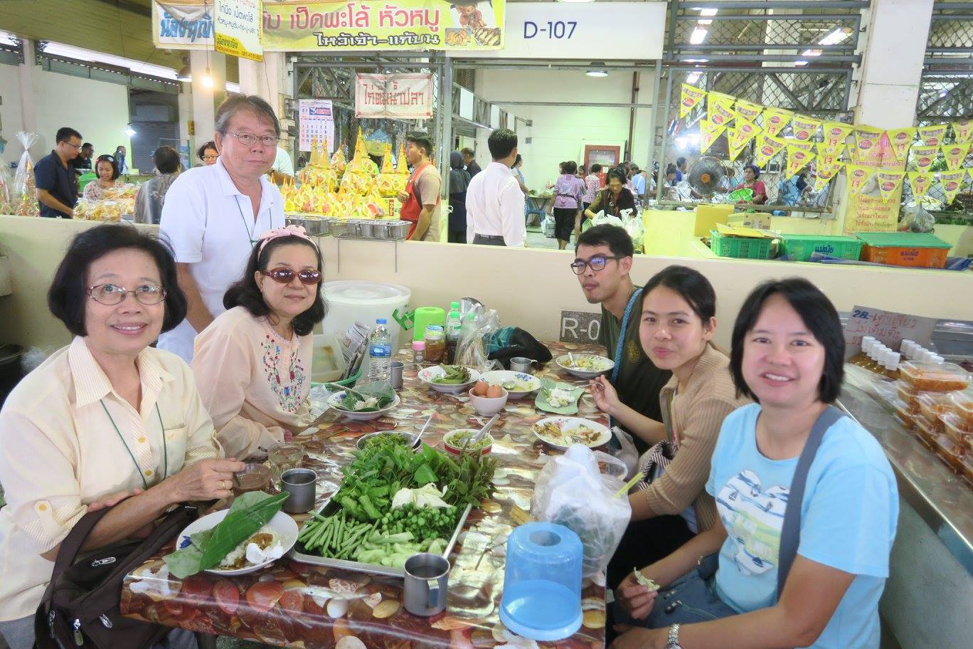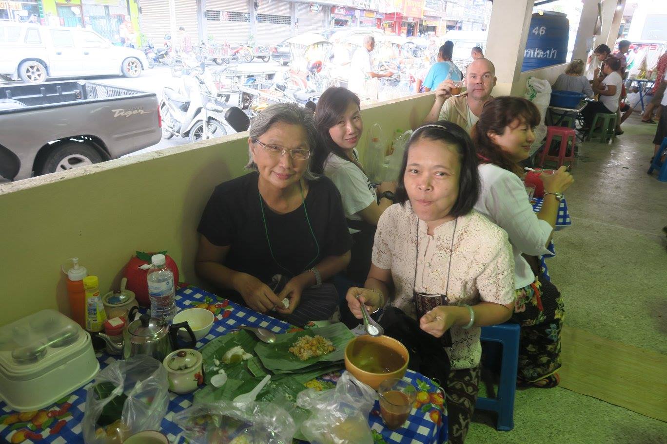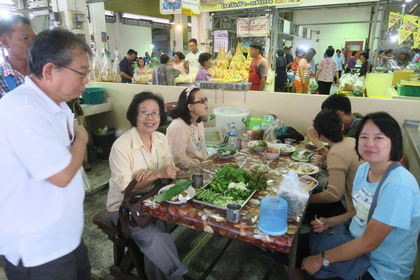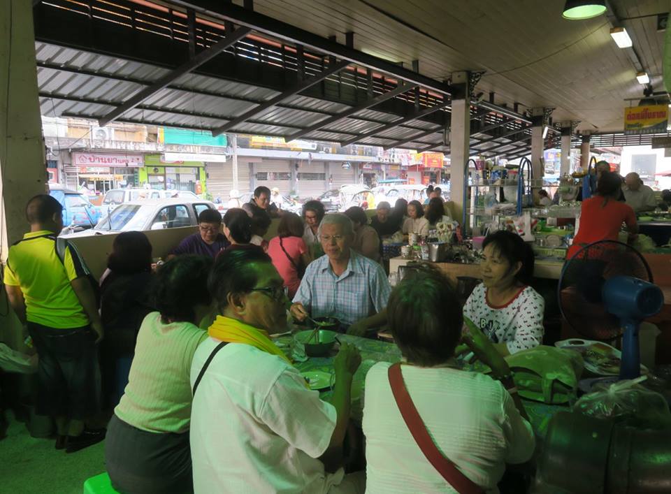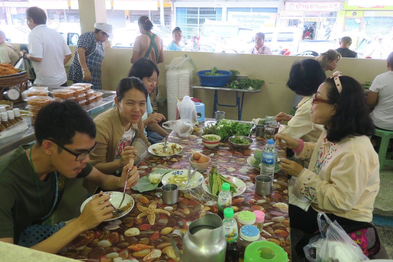 ถึงที่ตลาดก็ทำง่าย ๆ ให้ทุกคนเดินตามเพียง ๕ นาที มีไมโครโฟนตัวนึงชี้ประกาศว่าตรงนั้นนั่นนี่โน่น ลูกเนียงต้ม ข้าวเหนียวกลอย เหนียวเหลือง เหนี่ยงปิ้ง ไก่กอและ ข้ามมันดอกอ้อหน้าแกงกุ้ง หนมจีน ข้าวยำ น้ำพริก โรตีมะตะบะ กะขนมหรั่ง แล้วให้เลือกซื้อหามานั่งกินร่วมกันที่ร้านน้ำชากาแฟริมตลาด แล้วเลือกจ่ายตลาดตามอัธยาศัยให้พร้อมล้อหมุนที่หน้าร้นทองบูรพา ๙ ตรงข้ามตลาด เวลา ๐๘.๓๐ ตรง