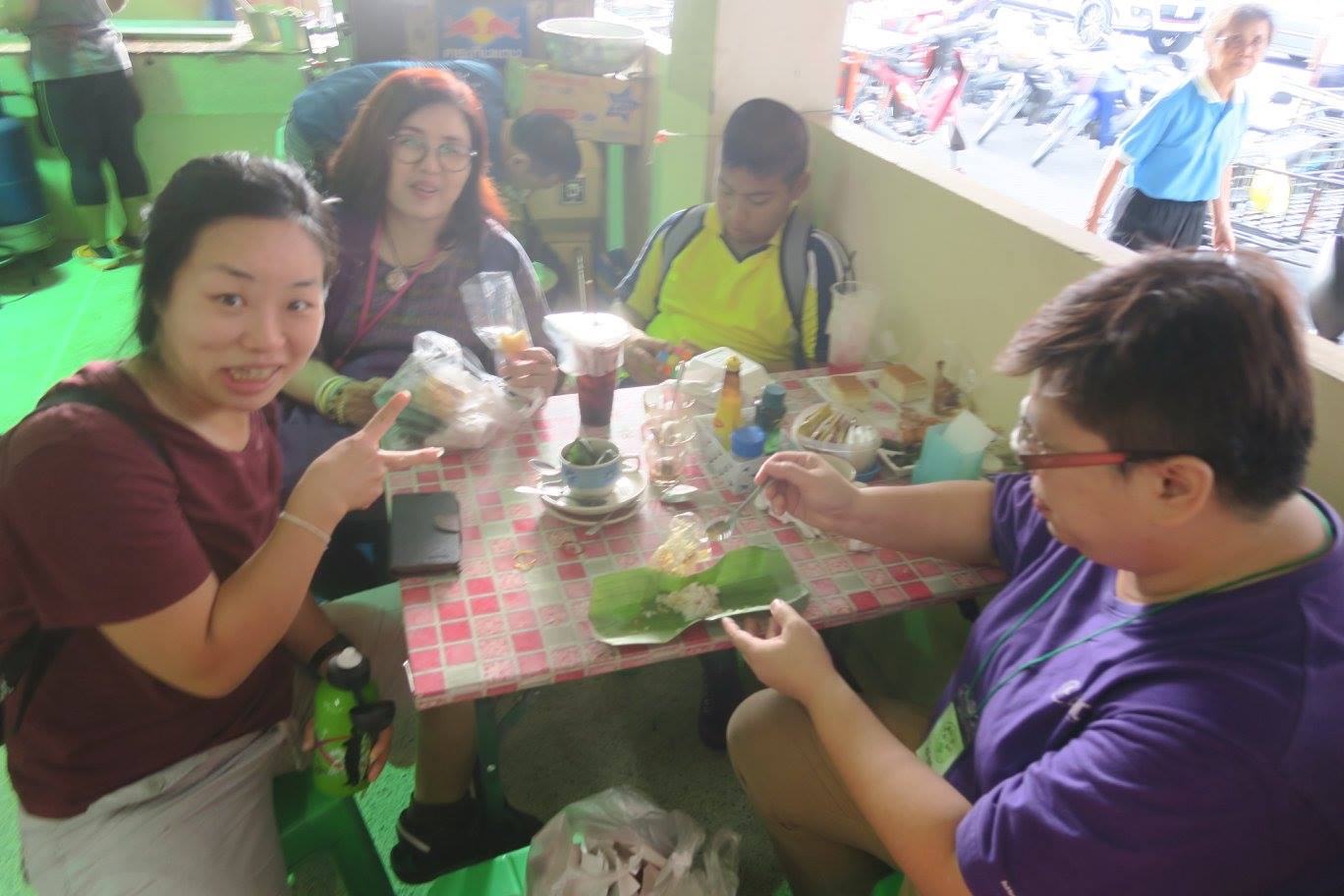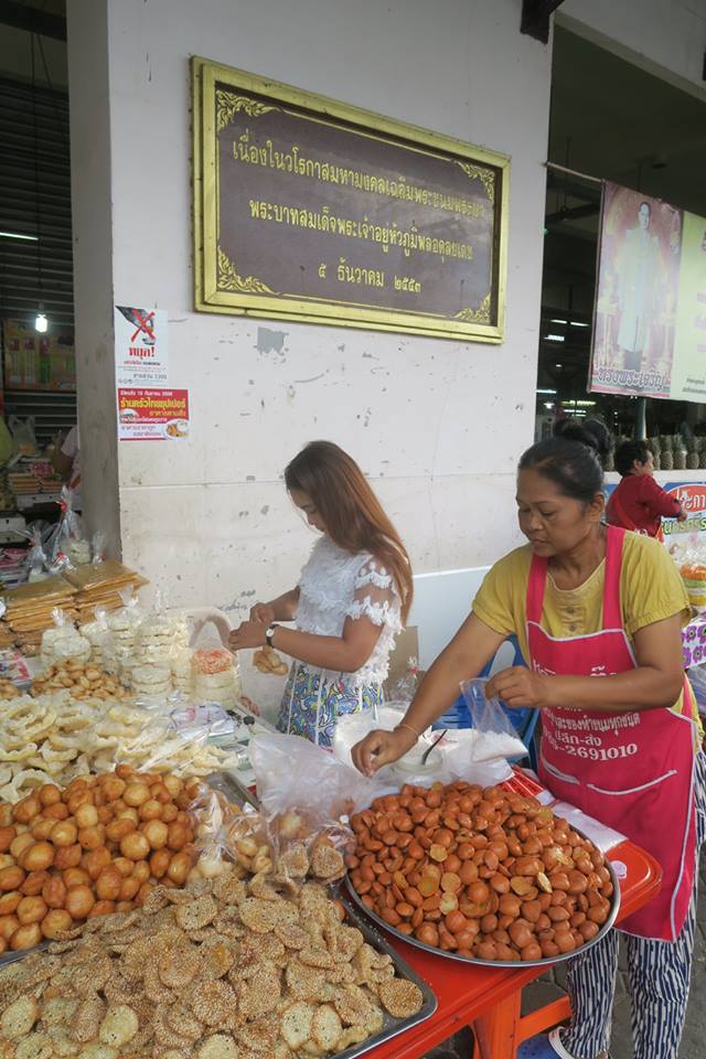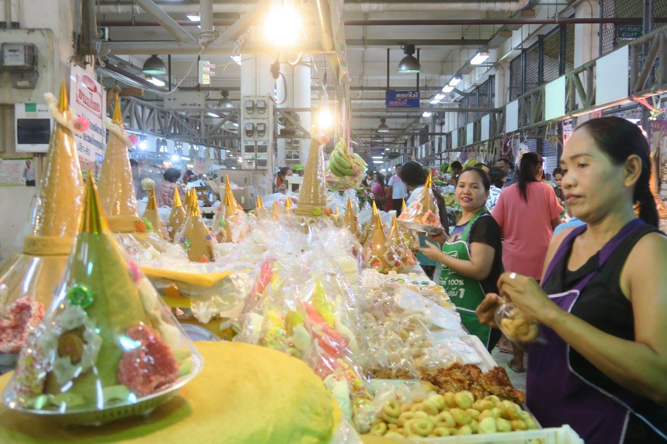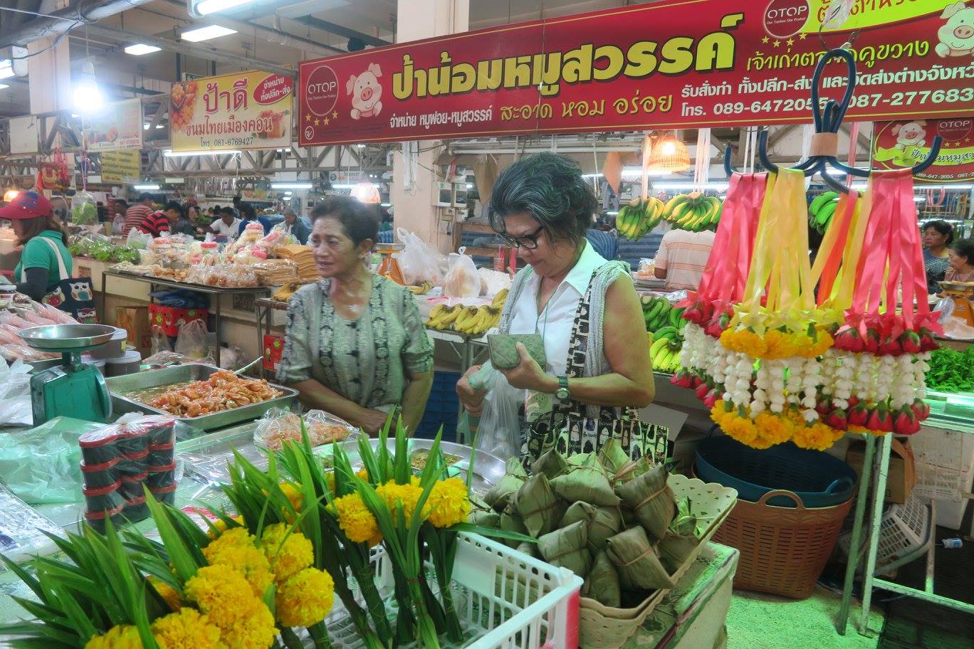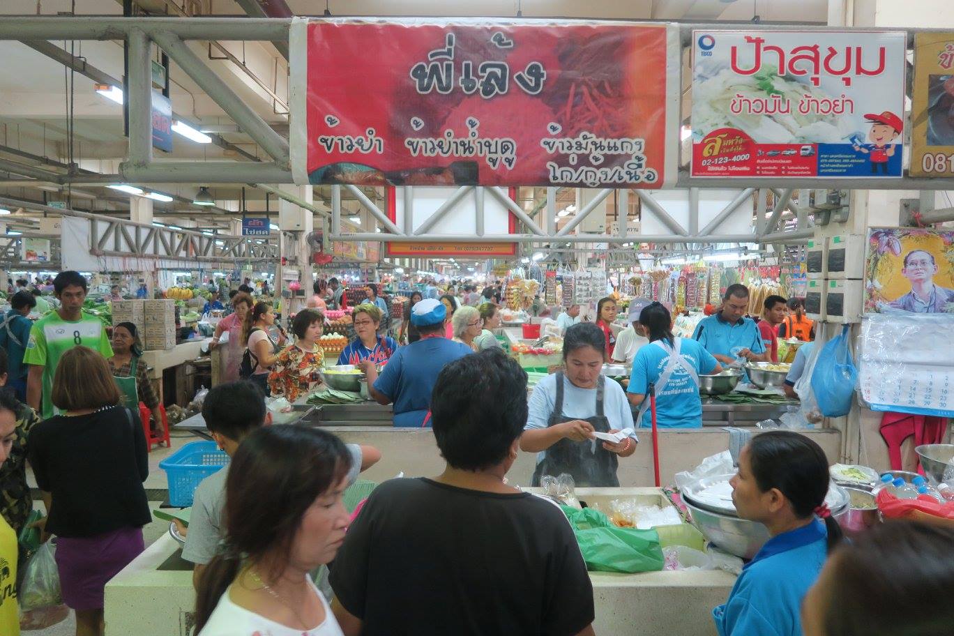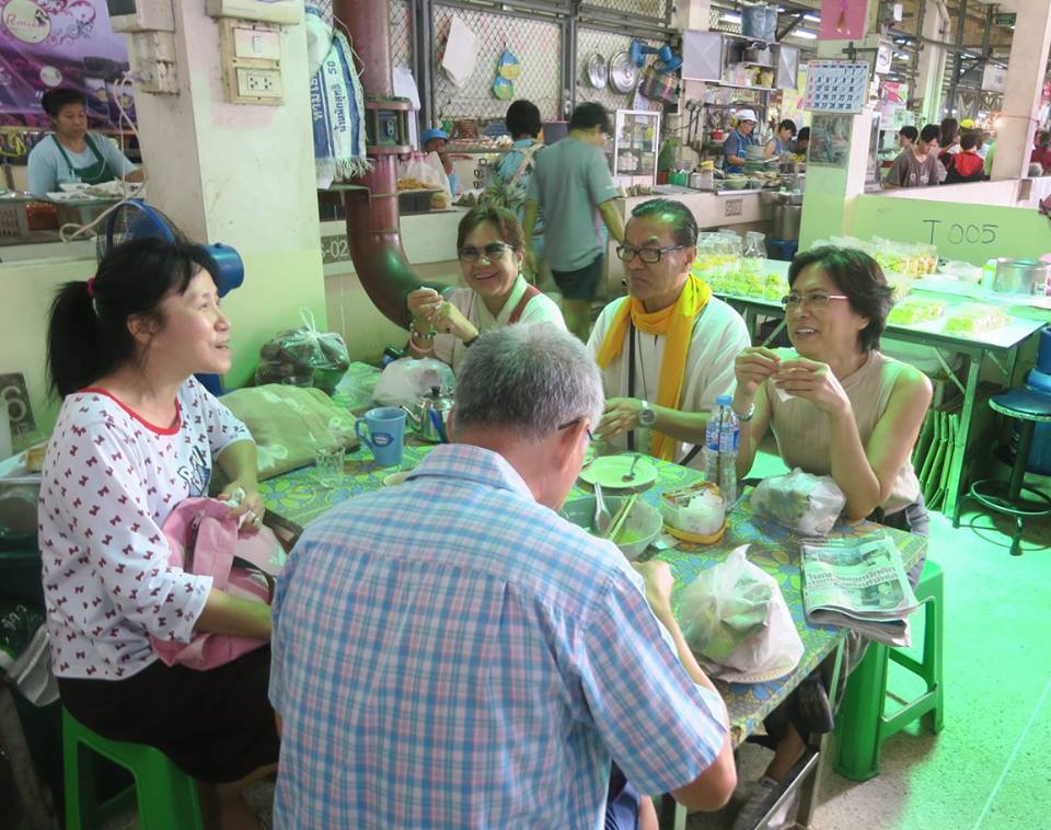 ถึงที่ตลาดก็ทำง่าย ๆ ให้ทุกคนเดินตามเพียง ๕ นาที มีไมโครโฟนตัวนึงชี้ประกาศว่าตรงนั้นนั่นนี่โน่น ลูกเนียงต้ม ข้าวเหนียวกลอย เหนียวเหลือง เหนี่ยงปิ้ง ไก่กอและ ข้ามมันดอกอ้อหน้าแกงกุ้ง หนมจีน ข้าวยำ น้ำพริก โรตีมะตะบะ กะขนมหรั่ง แล้วให้เลือกซื้อหามานั่งกินร่วมกันที่ร้านน้ำชากาแฟริมตลาด แล้วเลือกจ่ายตลาดตามอัธยาศัยให้พร้อมล้อหมุนที่หน้าร้นทองบูรพา ๙ ตรงข้ามตลาด เวลา ๐๘.๓๐ ตรง