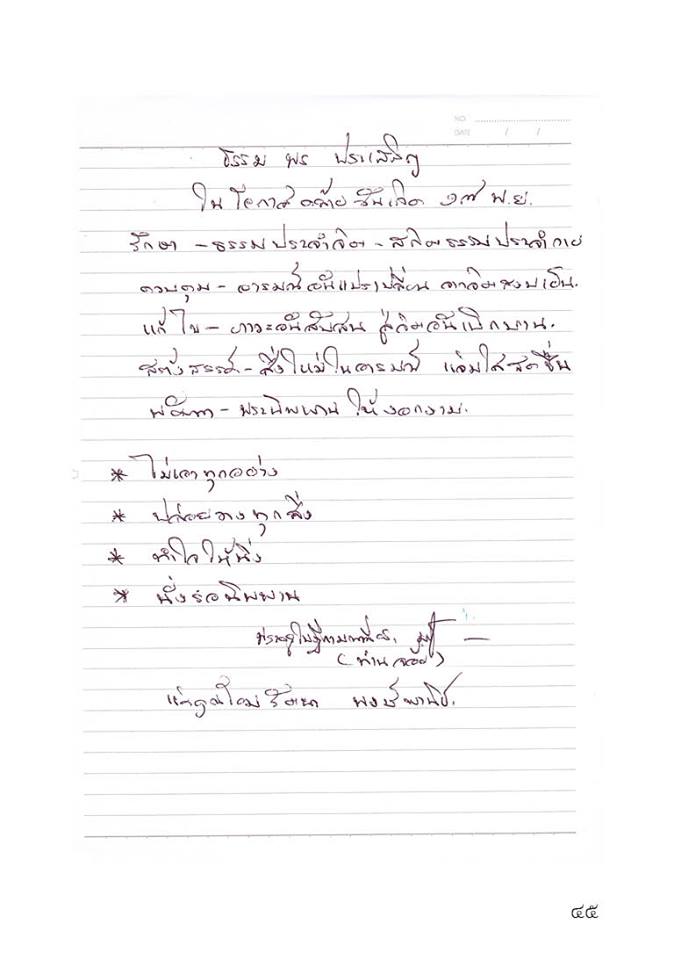อยู่ทางโน้น แม่ได้เฝ้าพระองค์ท่านหรือยังครับ ทางนี้ ยังไม่รู้ว่าจะได้พาน้าพาไปเฝ้าถวายสักการะพระองค์ท่านเมื่อไหร่ น้าพาบอกว่าไปมาแล้วทุกพระองค์ ตั้งแต่ในหลวงอานันท์, พระนางรำไพฯ, สมเด็จย่าฯ, พระพี่นางฯ ทำนองว่ายังไง ๆ ก็จะต้องไปให้ได้แม้คราวนี้จะไม่ได้ไปพร้อมกับแม่อย่างคราวก่อน ๆ