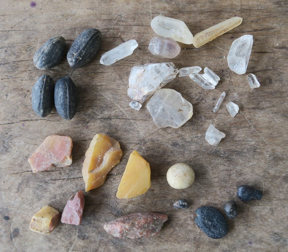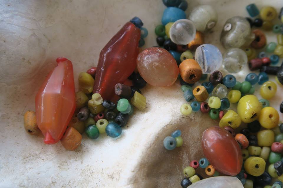 ส่วนลูกปัด เท่าที่เห็น มีหินคาร์เนเลียน กับ หินแก้วผลึก (rock crystal) ไม่เห็นอะเกต จากนั้นก็แก้วอินโดแปซิฟิคหลายสีและเป็นหลอด มีอำพันเงิน (silver sandwich) รวมทั้งเศษลูกปัดโมเสกหน่อยหนึ่ง