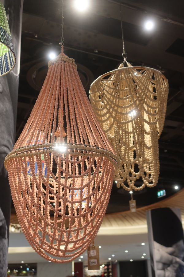 โคมไฟชุดหนึ่ง เขาร้อยลูกปัดน่าจะทำจากเม็ดไม้หลายลีลาดูสวยดี