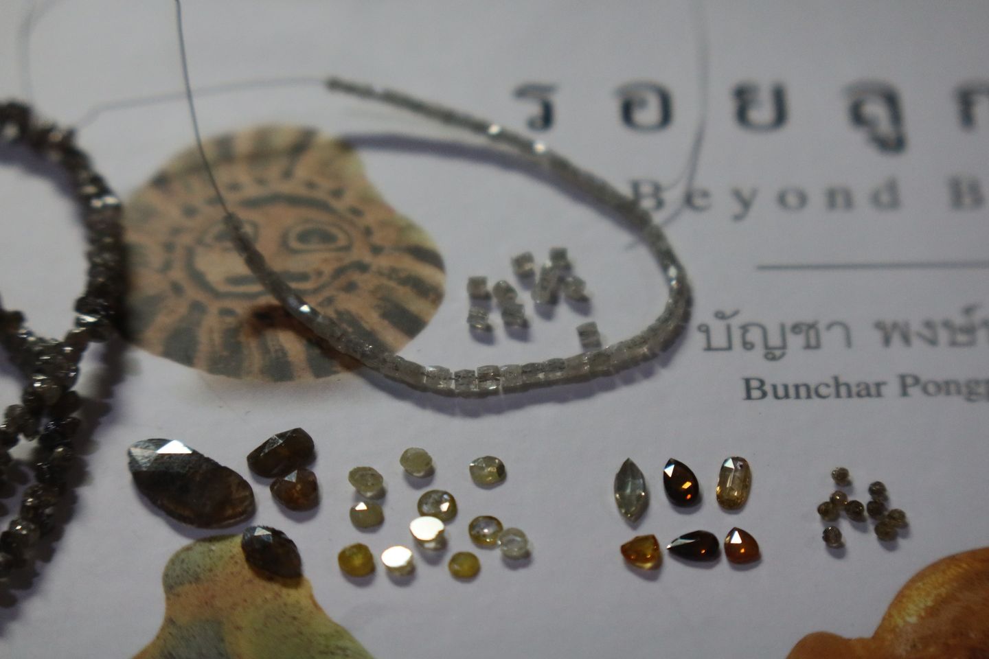 ขณะที่เขาก็ชี้ชวนดูตัวอย่างเพชรต่าง ๆ ที่เขาเอามาตัดมาเจียร์