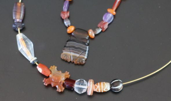 ๒) #ตรีรัตนะโกเมนมีแกะรูปใบหน้าคน บนสายลูกปัดโกเมนสลับทอง พบที่ขเมายี้มะลิวัน
