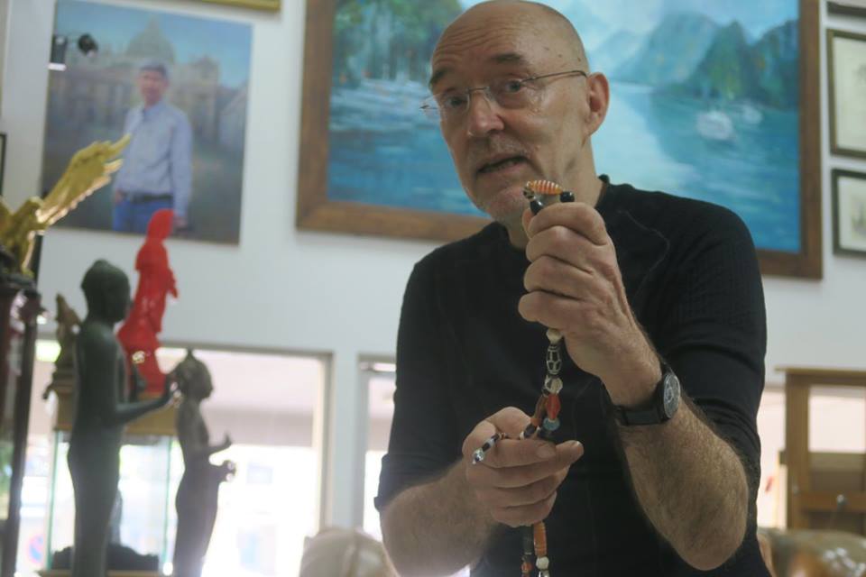 ๑) เขาออกตัวว่า จริง ๆ ไม่ได้สนใจมาก่อน แต่มาฝึกสมาธิที่อินเดีย แล้วมีคนรู้จักสะสมเหรียญแล้วได้ลูกปัดแถมมา ก็เลยให้เขา เขาก็แค่คิดว่าน่าจะขายได้ราคา แต่ค้นไปค้นมา พบว่ามีคุณค่าและความหมายอยู่เบื้องหลังมากมาย โดบเฉพาะสัญญลักษณ์ในพระพุทธศาสนาที่ลึกมาก ๆ