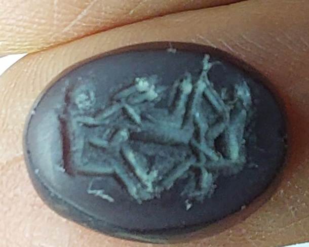ส่วนอีกชิ้นดูเหมือนเป็นตราตอกบนอะไรสักอย่าง ยังไม่แน่ใจครับ