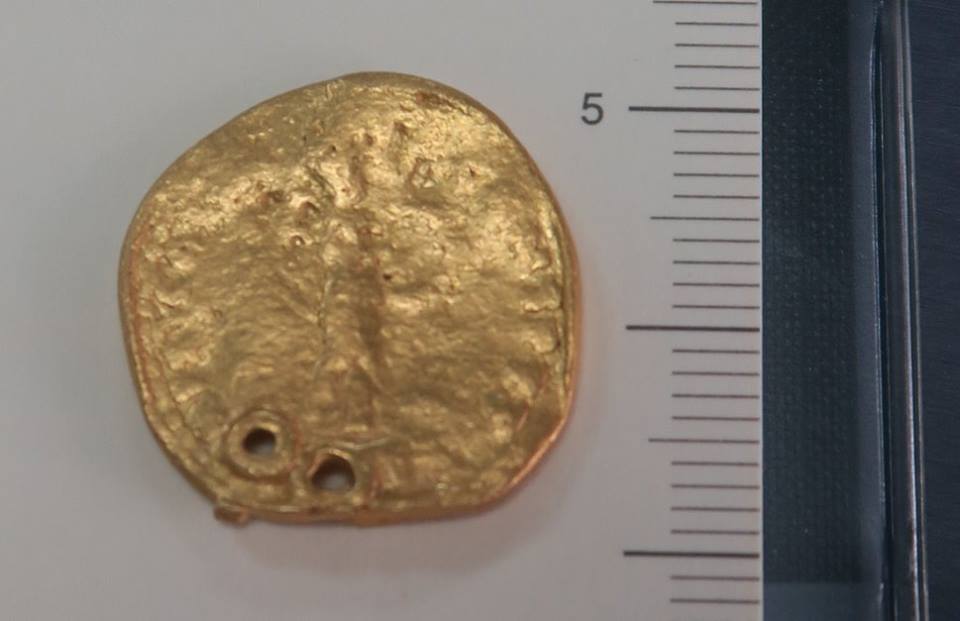 "These are interesting news. The coin from BKN with the two holes seems to be a genuine Roman gold coin of Domitian (81-96 CE), although very worn. The weight would be intersting. The alternative would be a very good copy, as they are known from India. The two holes are also a characteristic for Roman gold coins found in India (and their Indian imitiations) to be worn as a pendant. However, above the two holes there is something to be seen, which looks to me like a bit of gold wire, possibly from a spiral type of suspension loop as on other pendants from Khlong Thom. Anyway, it would be the first find of a genuine Roman gold coin in Thailand."