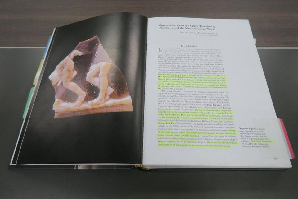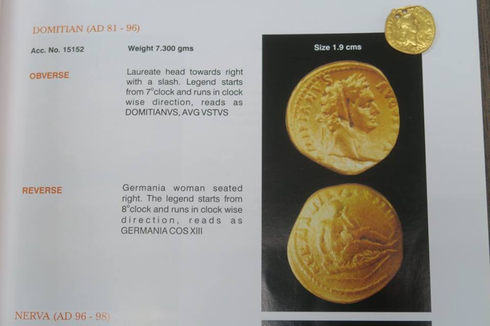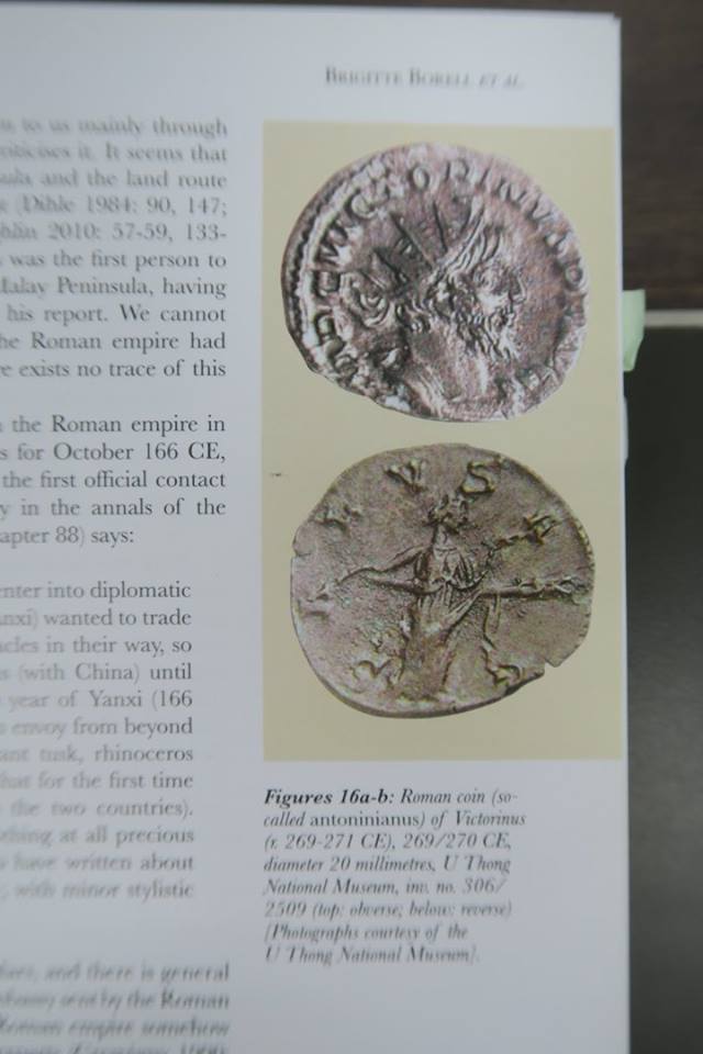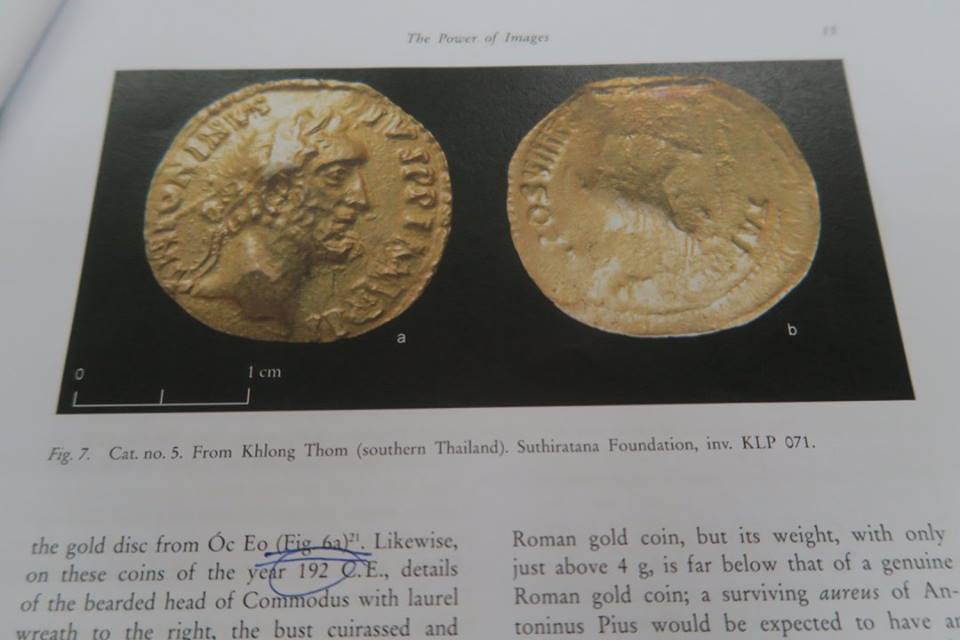 ๑) การพบเหรียญทองคำโรมันครั้งแรกมนอินเดียนั้นพบที่เมือง Nellore ใกล้มัทราสที่ทุกวันนี้เรียกว่าเชนไน เมื่อปี คศ.๑๗๘๗ เป็นเหรียญจักรพรรดิฮาเดรียน พระนางฟอสตินา และ จักรพรรดิแอนโตนินุส ไพอุส จากนั้นก็พบเรื่อยมา ที่มากสุดคือพบทีเดียว ๑,๕๐๐ เหรียญที่ Nalgonda และในการขุดค้นทางโบราณคดีที่นาคารชุนโกณฑะซึ่งพบเหรียญของจักรพรรดิฮาเดรียน ออกัสตัส จักรพรรดิทะเบอรุส และพระนางฟอสตินา แล้วก็มีพบต่อมาเรื่อย ๆ โดยรวมแล้วมีพบเหรียญของ ๒๕ จักรพรรดิ-พระนาง คาบตั้งแต่ ๒๗ ปี ก่อน ค.ศ.จนถึง ค.ศ.๕๑๘ แต่ที่เขารายงานในเล่มนี้ เป็น ๕๙ เหรียญที่พบพร้อมกันในกรุที่ Penuganchiprolu มีรูปและผลการศึกษาว่าเป็นของจักรพรรดิพระองค์ไหนจำนวนเท่าไร แทบทั้งน้ันมีพบทำจี้ที่พบในประเทศไทย รวมทั้งจี้อันใหม่นี้ซึ่ง ดร.บริจิตต์บอกว่าอาจจะเป็นเกรียญแท้ของจักรพรรดิ Domitian ครองราชย์ ค.ศ.๘๑ - ๙๖ แต่ดูรูปแล้วยังไม่ค่อยแน่ใจ