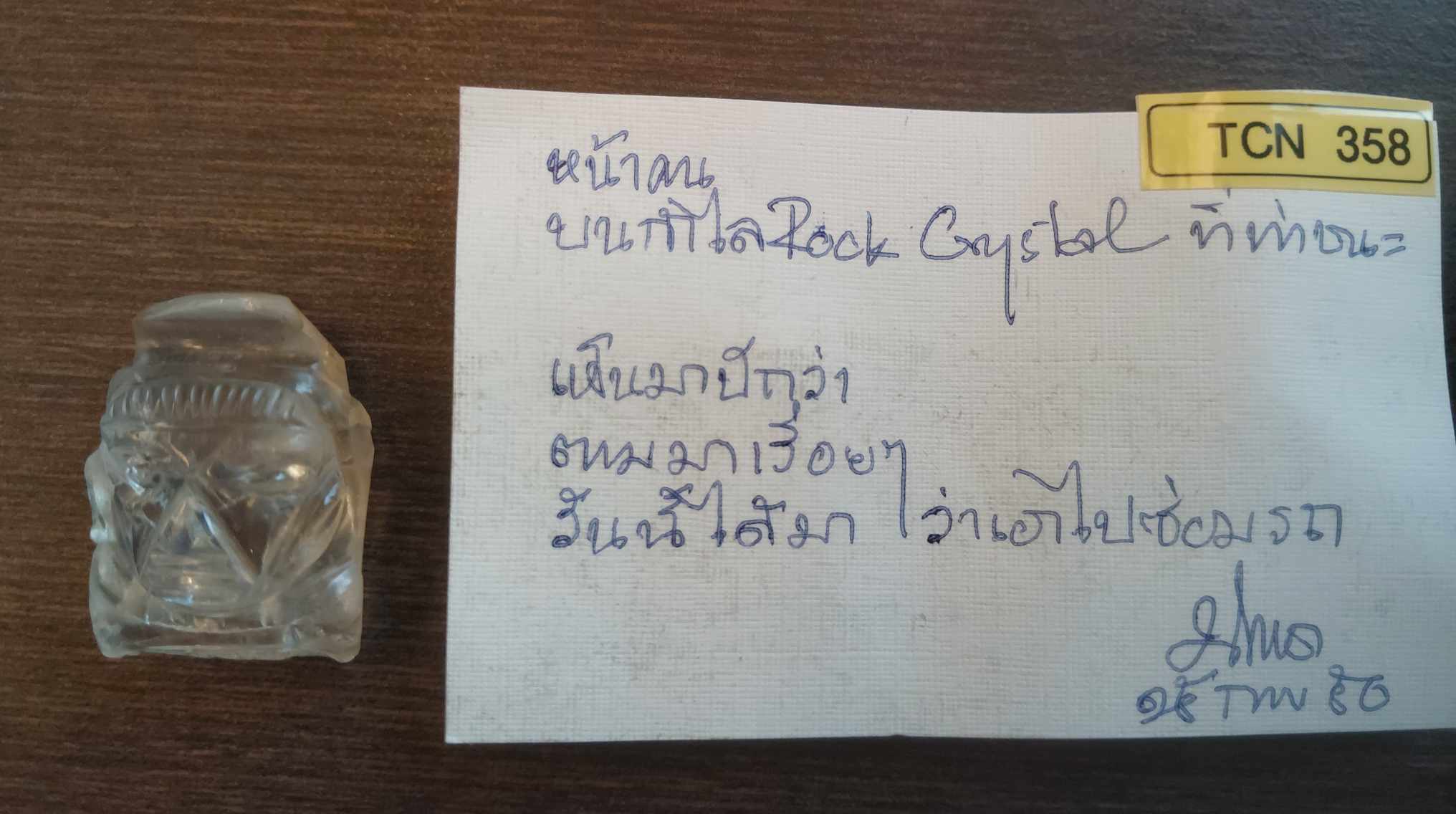 สอง ก้อนหินน้ำค้างขาวใสคล้าย ๆ ปลายกำไลหัก แกะเป็นรูปหน้าคน