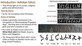 " ... จารึกของพระเจ้าอโศก จะใช้คำว่า 'เทวานํ ปิย ปิยทสี' เมื่อจะหมายถึงพระองค์