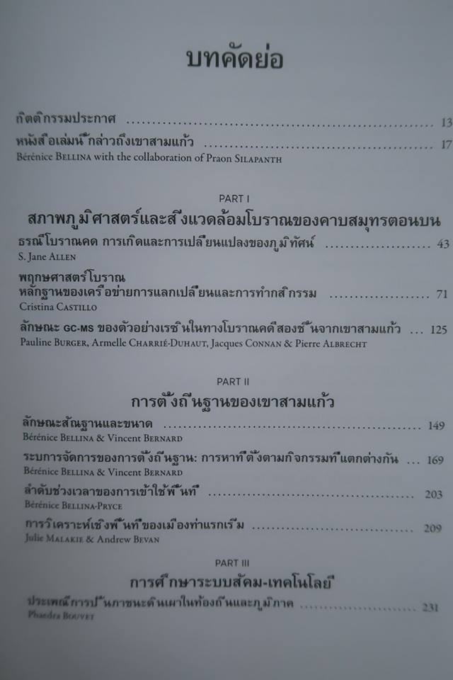ซึ่งจากผลวิเคราะห์ทางโบราณคดีธรณีวิทยา โบราณคดีพืชศาสตร์ สรุปว่าดินแดนด้านในแผ่นดินของเขาสามแก้วนั้นอุดมสมบูรณ์ เหมาะแก่การเพาะปลูก มีป่าเขา ผลผลิตจากป่า ไม้ซุง นานานก รวมทั้งน้ำจืด รวมทั้งเส้นทางที่เชื่อมต่อและที่ราบลุ่มน้ำที่แห้งเหมาะต่อการตั้งถิ่นฐาน แถมยังมีอ่าวและลากูนที่เรือเดินทะเลสามารถมาจอดพักได้ดี แม้จะมีการตกตะกอนตื้นเขิน รวมทั้งการกัดเซาะ หรือน้ำหลากท่วม รวมทั้งการเปลี่ยนทางของสายน้ำ ที่ทำให้พื้นที่นี้ถูกละทิ้งหลังจากผ่านความเจริญสูงยิ่ง ที่สำคัญคือ จากหลักฐานการศึกษาพืชโบราณ พบว่าแหล่งโบราณคดีเขาสามแก้วนี้มีสถานะเป็นเมืองท่ากลางจากหลายทิศทางโดยเฉพาะเอเชียใต้และจีนตั้งแต่ยุคโลหะ กล่าวคือผู้คนที่เขาสามแก้วสมัยโบราณบริโภคข้าวเจ้าเป็นหลัก โดยมีข้าวฟ่างและพืชพันธ์จากอินเดียใต้ด้วยแล้ว โดยเมื่อพุทธศตวรรษที่ ๒-๔ ก็พบมีการใช้น้ำมันยางด้วยแล้ว ส่วนการตั้งถิ่นฐานพบว่ามีขนาดใหญ่มากมาตั้งแต่ยุคโลหะที่มีการใช้ทั้งขอบเขตทางธรรมชาติและการก่อเป็นเนินดิน ในลักษณะสอดคล้องกับภูมิประเทศที่มีการเปลี่ยนแปลงและความหลากหลายของประชากร กล่าวคือตั้งอยู่ห่างจากชายฝั่งทะเลปัจจุบัน ๕ กิโลเมตร ครอบคลุม ๔ เนินเขาโดยมีลำคลองท่าตะเภาเป็นขอบด้านทิศตะวันตก กินอาณาบริเวณ ๓๕ เฮคตาร์ ภายในแนวเนินคันดินคู่ขนานที่ดูเหมือนจะมีการฝังไม้เป็นแนว และมีร่องคูขุดเลียบกันไป และน่าจะทำกัน ๒ ระยะ โดยระยะที่สองน่าจะเป็นการขยายเขตขึ้นไปทางทิศเหนือ ที่สำคัญคือไม่พบเช่นนี้ที่ไหนในช่วงเวลานั้นเลยในเอเชียตะวันออกเฉียงใต้ ยกเว้นแห่งเดียวคือที่ Co Loa ในเวียดนามเหนือ โดยเฉพาะการพบแนวเนินคันดินข้ามหุบเขาที่เขาสามแก้ว โดยที่หุบที่ ๑ นั้นเป็นคันรักษาระดับน้ำอาจเพื่อการล่องเรือขึ้นมา ในขณะที่หุบที่ ๓ เพื่อกั้นน้ำไว้ทางตะวันออกไม่ให้ไหลลงมาทางตะวันออก อาจเพื่อการเกษตร