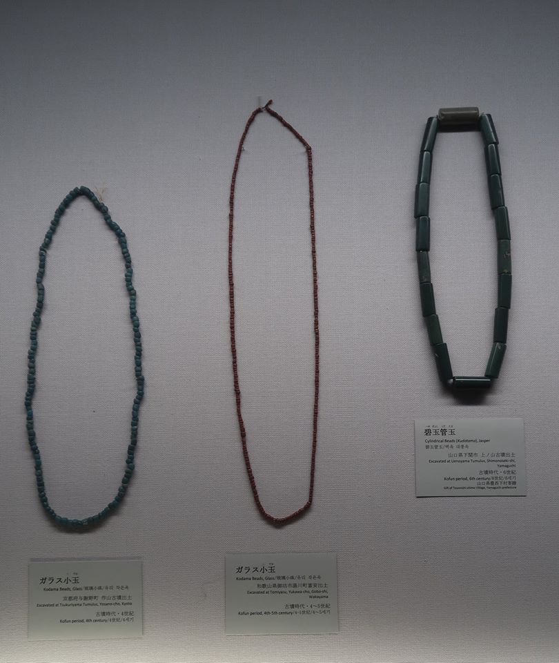 ในหอแสดงโบราณคดีที่พิพิธภัณฑ์สถานแห่งชาติญี่ปุ่น อูเอโนะนั้นมีตู้หนึ่ง แสดงถึงพัฒนาการของลูกปัดไว้ มีทั้งหินและแก้วกับอีกแผงหนึ่ง แสดงการขุดค้นพบเครื่องประดับต่าง ๆ โดยเฉพาะทองคำ และ ลูกปัดระบุว่าสมัย คศต.๔ - ๗ ก็ราว ๆ พศต. ๑๐ - ๑๓ ตอนเริ่มทวารวดีจนรุ่งเรืองที่ย่านบ้านเรา ซึ่งลูกปัดก็คล้าย ๆ ยกเว้นที่รูป Gecko หรือ Comma Shape ที่เหมือนไม่พบในไทยเราแต่ก็มีบางคนบอกว่า พบ ๆ ที่ราชบุรี มีกล่าวว่า พบลูกหนึ่งใหญ่มากคนใหญ่มากเช่นกันเก็บรักษาไว้ ผมเคยไปขอดู ว่าใหญ่จริงบอกว่ามีคนพบในลำน้ำแม่กลอง ที่พบสิ่งของต่าง ๆ มากมายรวมทั้งเครื่องสำริดลึกเลยสมัยฮั่นไปโน่นที่ลพบุรี ก็บอกว่ามีพบจึงอยากถามครับ ว่าในไทยทุกวันนี้ พบที่ไหนกันบ้างหากได้รูปมาด้วยจะขอบพระคุณยิ่งครับเพราะเจ้าลูกปักลูกน้ำนี้นั้น เป็นของสำคัญมาก ๆ ในตะวันออกไกลเฉพาะของญี่ปุ่นกับเกาหลีนั้นล้วนอยู่ในสุสานกษัตริย์ บนมหาชฏามงกุฎ เครื่องศิราภรณ์ต่าง ๆ ที่สำคัญที่สุด ถือเป็บ ๑ ใน ๓ ราชกกุธภัณฑ์สำคัญแห่งจักรพรรดิราชแดนอทิตย์อุทัย ในสมัยหนึ่ง ที่รบพุงกันรุนแรงเพื่อแย่งนี้ถึงกับเอาไปโยนทิ้งทะเลหายแล้วกลับมาได้ไงก็ไม่รู้ได้ ใช้กันมาจนถึงวันนี้ มีแก้วนี้ กับคันฉ่อง แล้วอะไรอีกอย่าง ลืมเสียแล้วครับ ไล่ดูภาพกันเองนะครับ