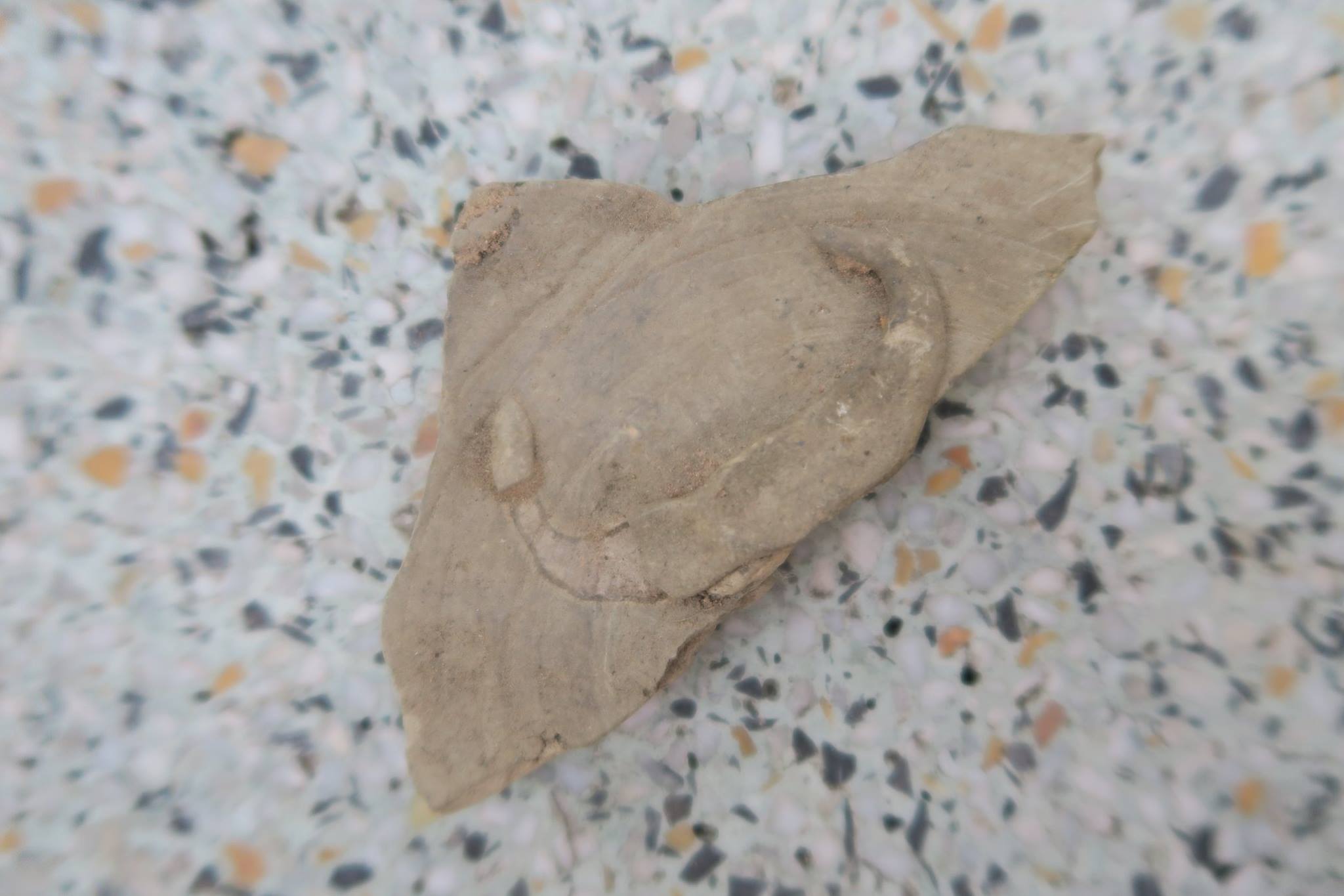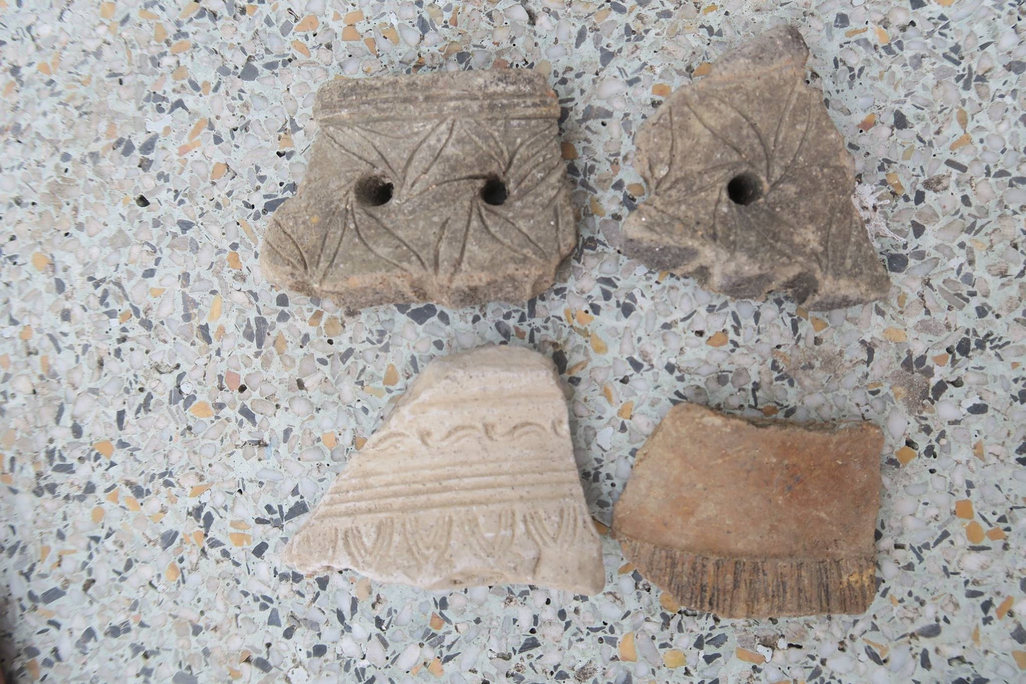 ภาพสองและสาม เป็นเครื่องถ้วยกลุ่ม Stoneware เนื้อแกร่ง กดประทับลายเอกลักษณ์ที่เรียกว่า Han Sherd ทำแพร่หลายที่จีนตอนใต้และเวียตนามตอนบนในสมัยราชวงศ์ฮั้่นตะวันออก ราว ๆ ๒,๐๐๐ ปีมาแล้ว หูภาชนะมีทำเป็นรูปหัวและเขาควายคล้ายชิ้นในภาพที่ ๒ ด้วย