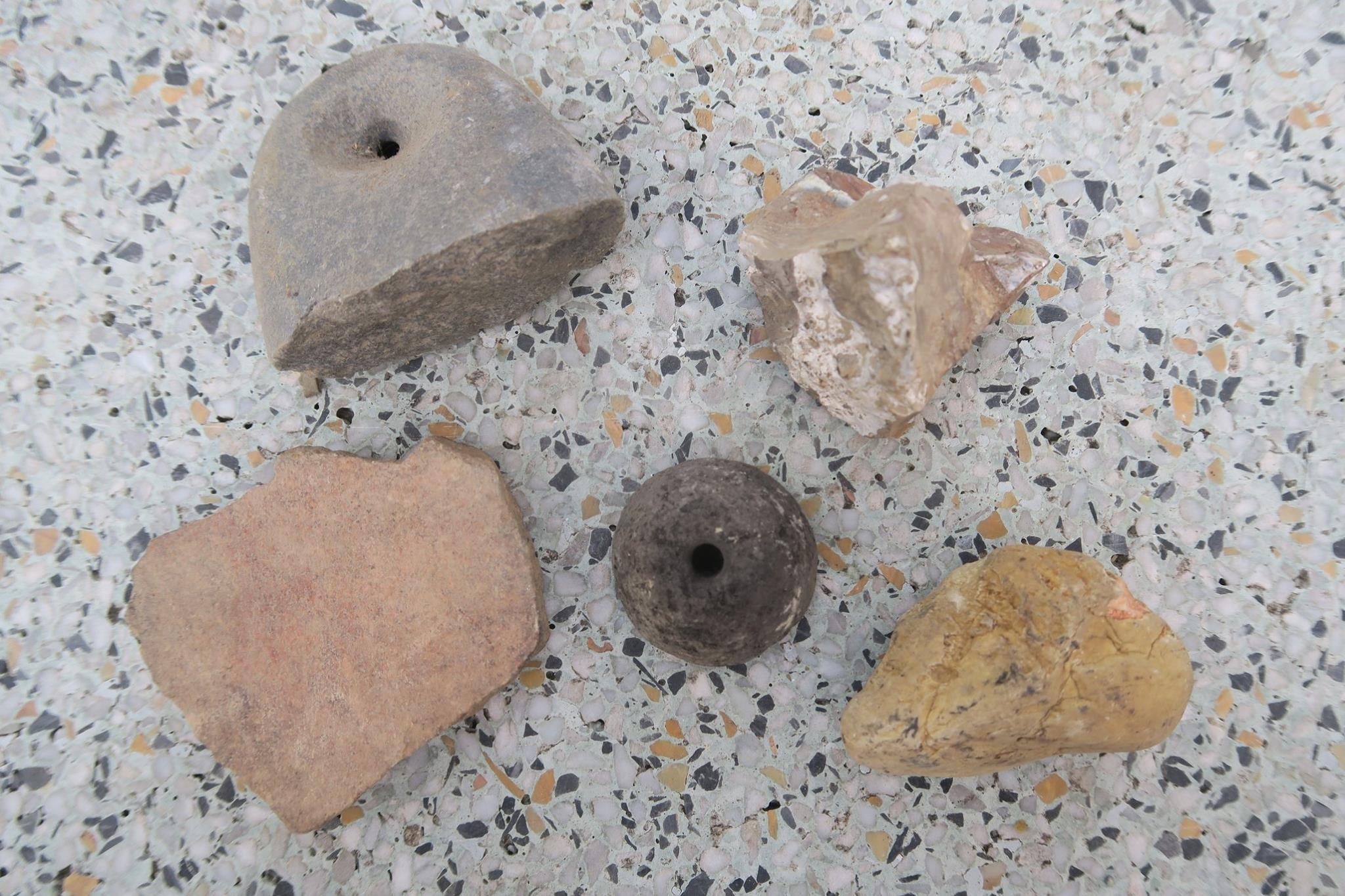 ภาพสิบ เป็นก้อนหินต่าง ๆ ชิ้นมีรู้ไม่รู้ใช้ทำอะไร มีลูกแวดินลูกหนึ่ง