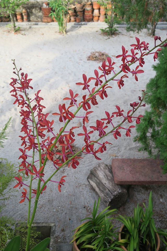 ดอกกล้วยไม้ดินกับหวายแดงกำลังบานสวยอยู่ใต้ซุ้มพวงโกเมน