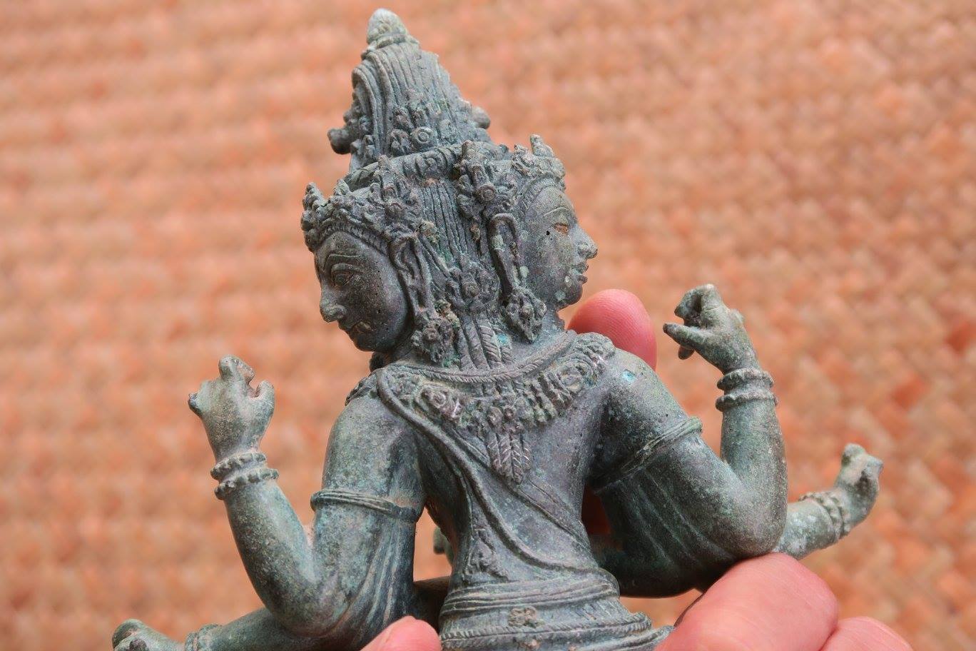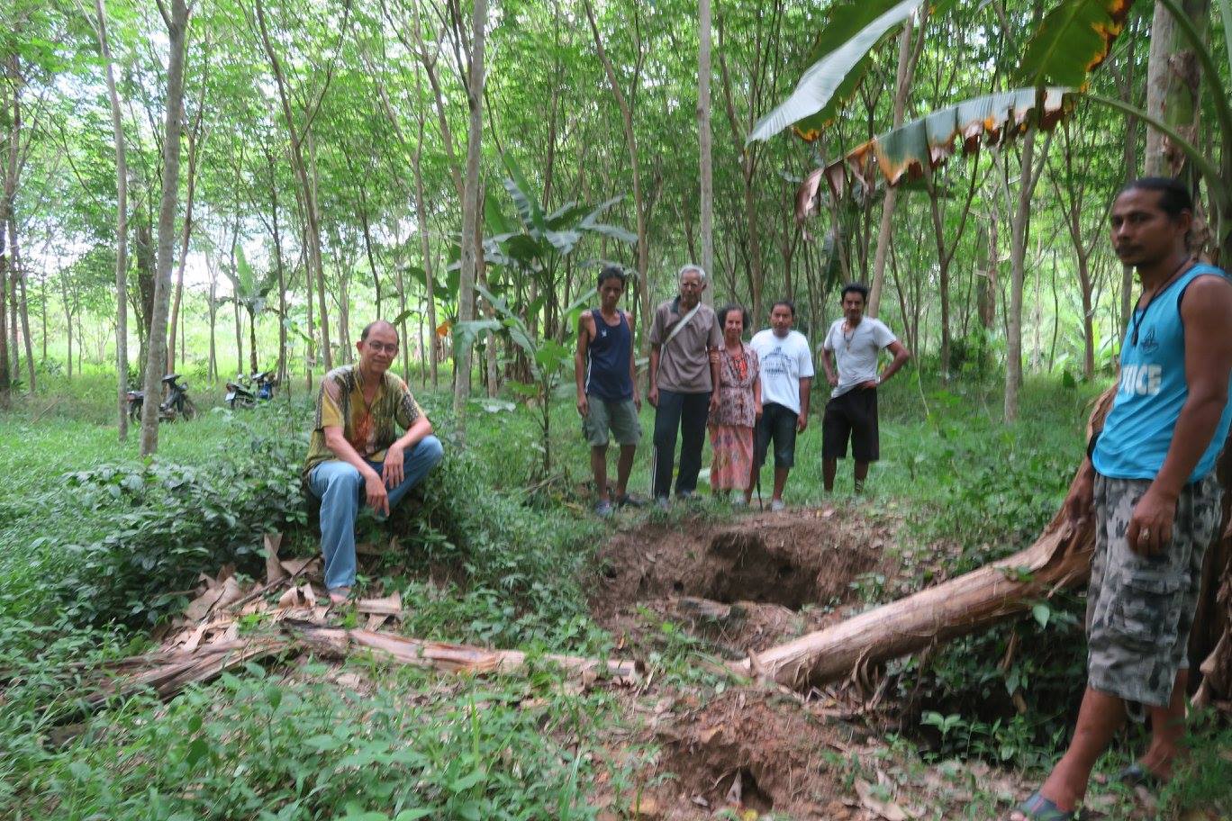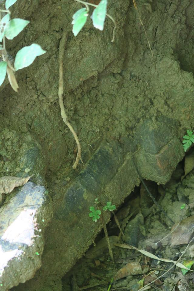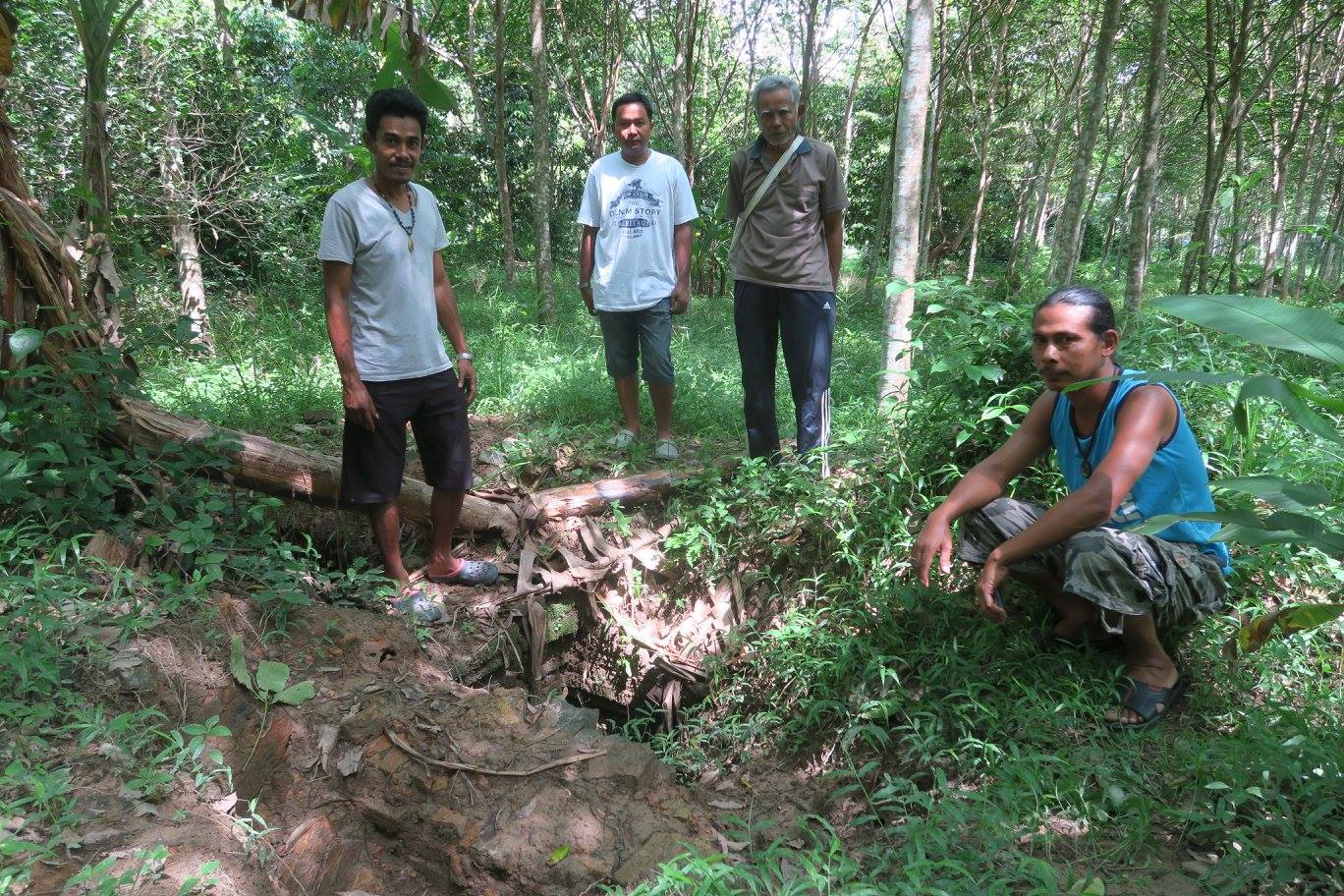 ๔) ศราวุธ ศรีทิพย์ บอกผมว่า พอดีตอนนี้มาทำงานประจำอยู่ที่บ้านจึงมีเวลา และราคายางก็ตก ญาติที่เป็นเจ้าของสวนจึงไม่ว่าอะไรหากจะสำรวจ เพราะกำลังรอการประกาศขายทั้งแปลง เท่าที่ได้ลองขุดคุ้ยนอกจากร่องและแนวดินกับมีอิฐเป็นบางแนวแล้ว ยังพบเศษกระเบื้องถ้วยมากมายหลายประเภทและยุคสมัย ที่ตำแหน่งหนึ่งน่าจะเป็นกรุอะไร มีก่ออิฐเป็น ๔ ช่อง ในนั้น พบฐานรูปทำด้วยสำริด คนละชิ้นกับรูปที่พ่อเจอเมื่อนานมาแล้ว