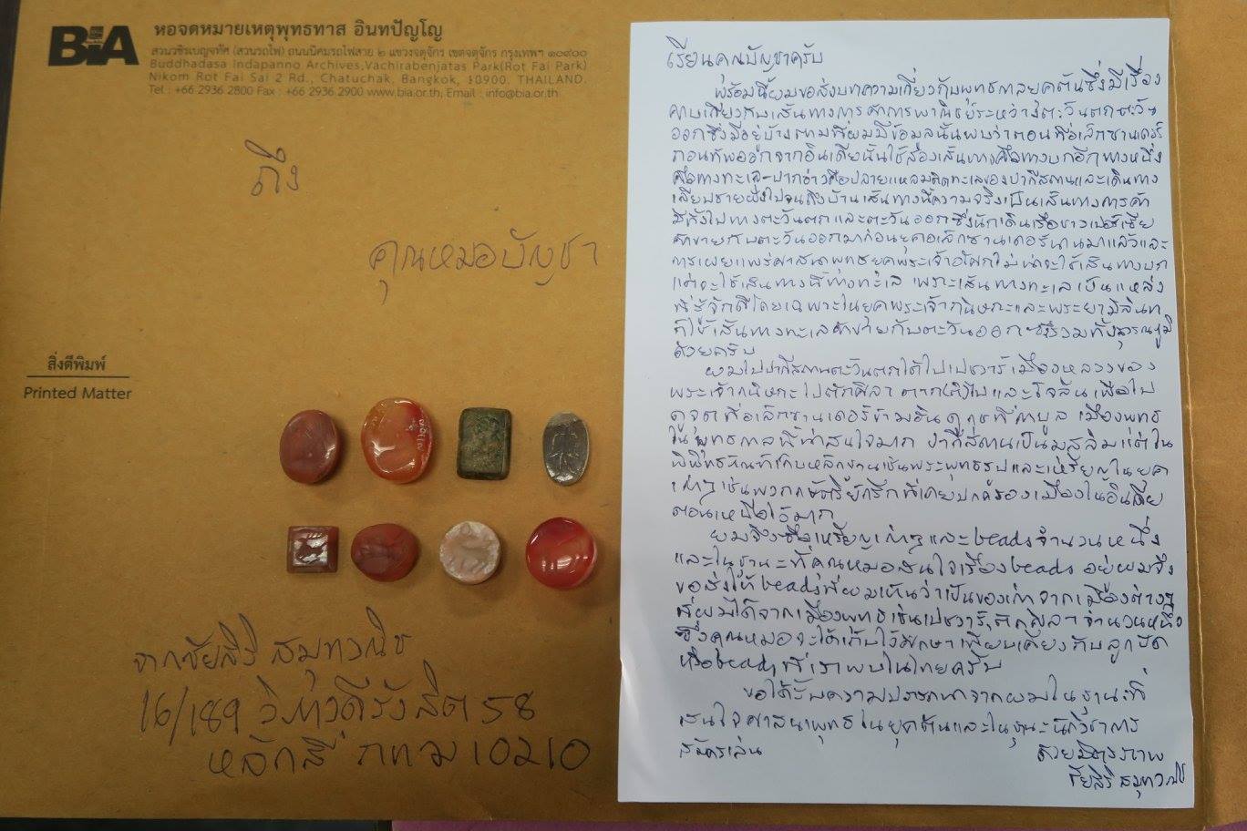 เมื่อช่วงเช้า มีอาวุโสท่านหนึ่งแวะไปสวนโมกข์ขณะที่ผมกลับไปงีบที่บ้าน กลับมาจึงพบจดหมายน้อยในซองเอกสารพร้อมหลายบทความ และ หัวแหวนทั้ง ๘ ที่ ระบุว่า "...ในฐานะที่คุณหมอสนใจเรื่อง beads อยู่ ผมจึงของส่งให้ beads ที่ผมเห็นว่าเป็นของเก่าจากเมืองต่าง ๆ ที่ผมได้จากเมืองพุทธ เช่น เปชวาร์ ตักสิลา จำนวนหนึ่ง ซึ่งคุณหมอจะได้เก็บไว้ศึกษาเทียบเคียงกับลูกปัดหรือ beads ที่เราพบในไทยครับ"