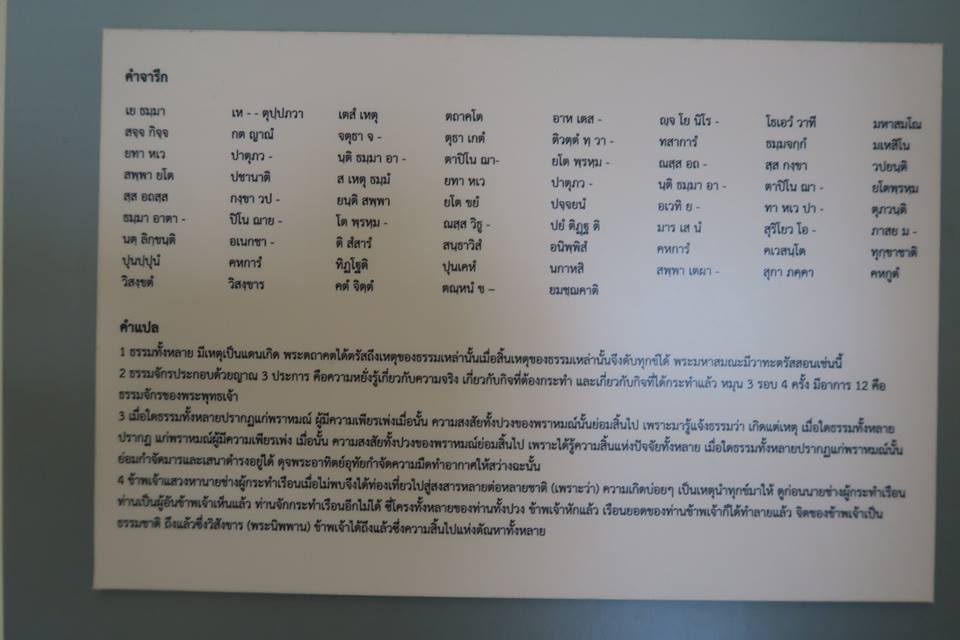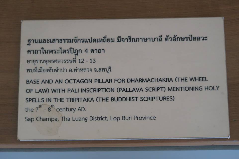 ภาพเสาธรรมจักรหลักสำคัญจากเมืองซับจำปา อ.ท่าหลวง ลพบุรีจารึกคาถาต่าง ๆ ที่สำคัญในพระพุทธศาสนา ประกอบด้วย คาถาเยธัมมา หรือ ปฏิจจสมุปบาทอย่างย่อ คาถาธรรมจักรกัปปวัตนสูตร คาถาปฐมพุทธภาษิต และ คาถาพุทธอุทาน เมื่อแรกตรัสรู้ ณ โคนพระศรีมหาโพธิ์ ในคืนเพ็ญวิสาขบูชา