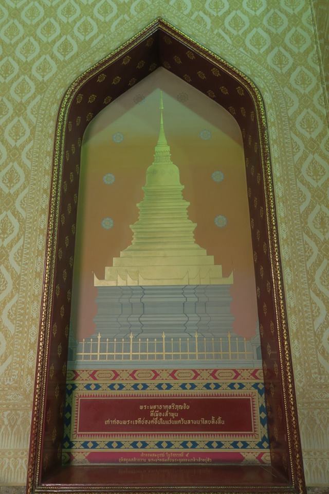ภาพ เมื่อนำเพื่อนจากพม่าแวะนมัสการพระพุทธชินราชจำลองที่วัดเบญจมบพิตรและสวนโมกข์กรุงเทพ ในคูหาพระอุโบสถ มีภาพจิตรกรรมฝาผนัง ๘ จอมเจดีย์ของไทย เริ่มด้วยพระบรมธาตุเมืองนครที่ล้นเกล้าฯ พระบามสมเด็จพระเจ้าอยู่หัว รัชกาลที่ ๙ ทรงเป็นเจ้าภาพให้วาดถวายพระราชกุศลแด่รัชกาลที่ ๕