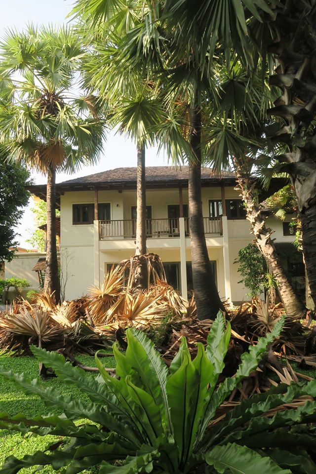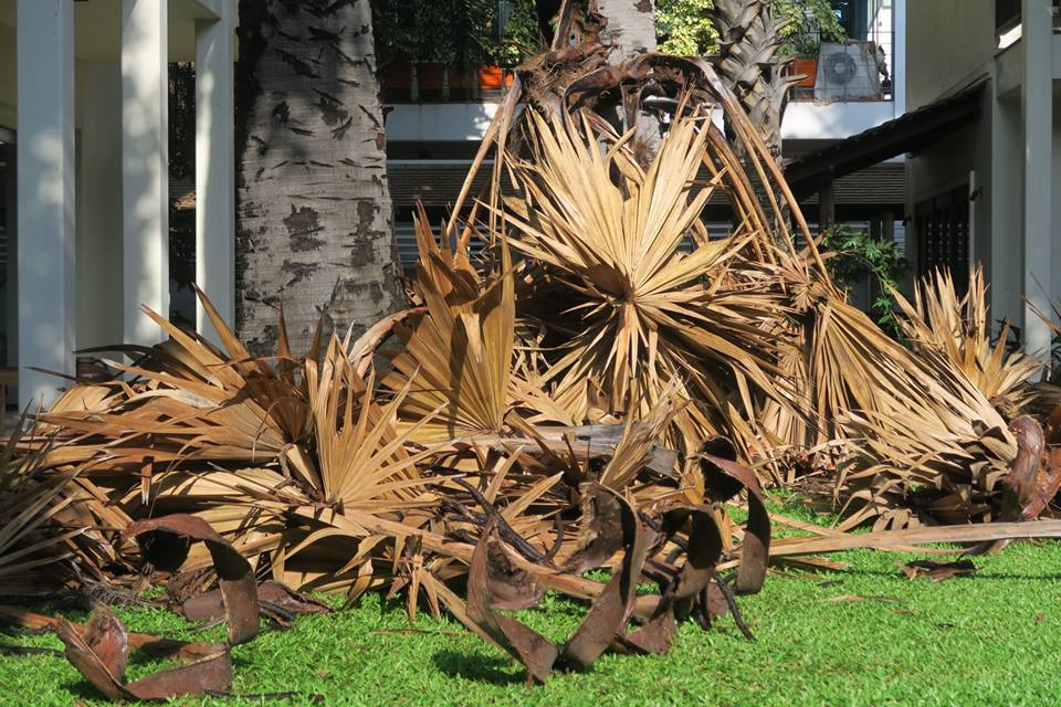 ภาพ ต้นตาล ๑๔ ต้นในลานบ้านกับการตัดแต่งใบแก่ที่ติดเนื่องอยู่กับลำต้น ลักษณะเดียวกับอกุศลที่เป็นเชื้อนอนนิ่งอยู่ในสันดาน พร้อมที่จะรวมกันแล้วหล่นร่วงลงในคราวเดียวมาทับถมถูกผู้คนสิ่งของ ต้องเอาออกไปเสียก่อน เสมอ ๆ