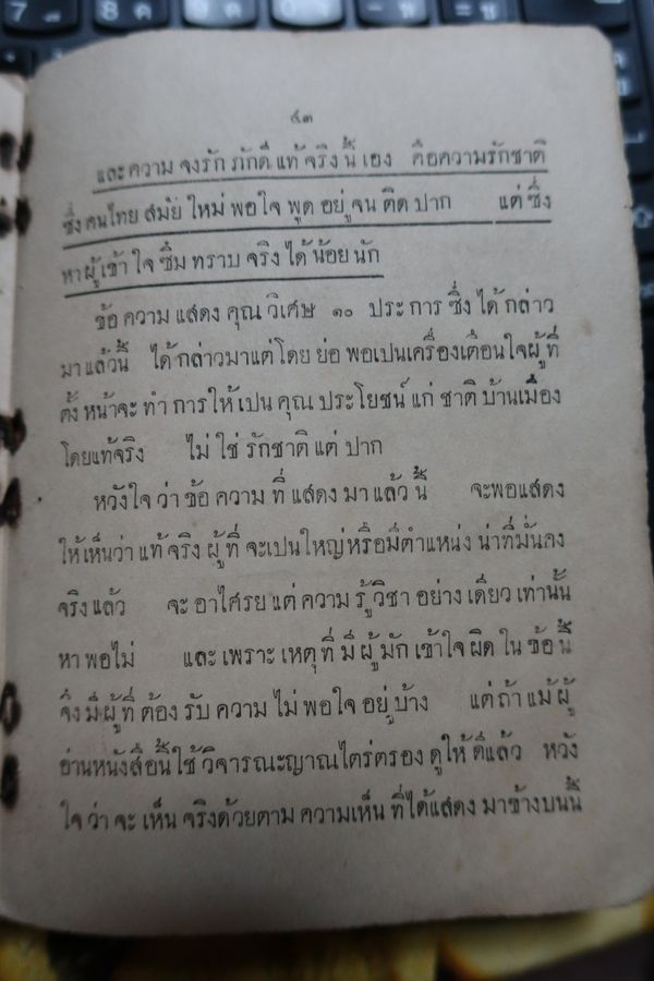 " ... ข้อความแสดงคุณวิเศษ ๑๐ ประการ ซึ่งได้กล่าวมาแล้วนี้ ได้กล่าวมาแต่โดยย่อพอเปนเครื่องเตือนใจผู้ที่ตั้งหน้าจะทำการให้เปนคุณประโยชน์แก่ชาติบ้านเมืองโดยแท้จริง ไม่ใช่รักชาติแต่ปาก