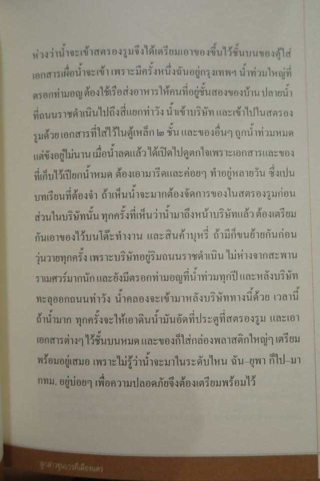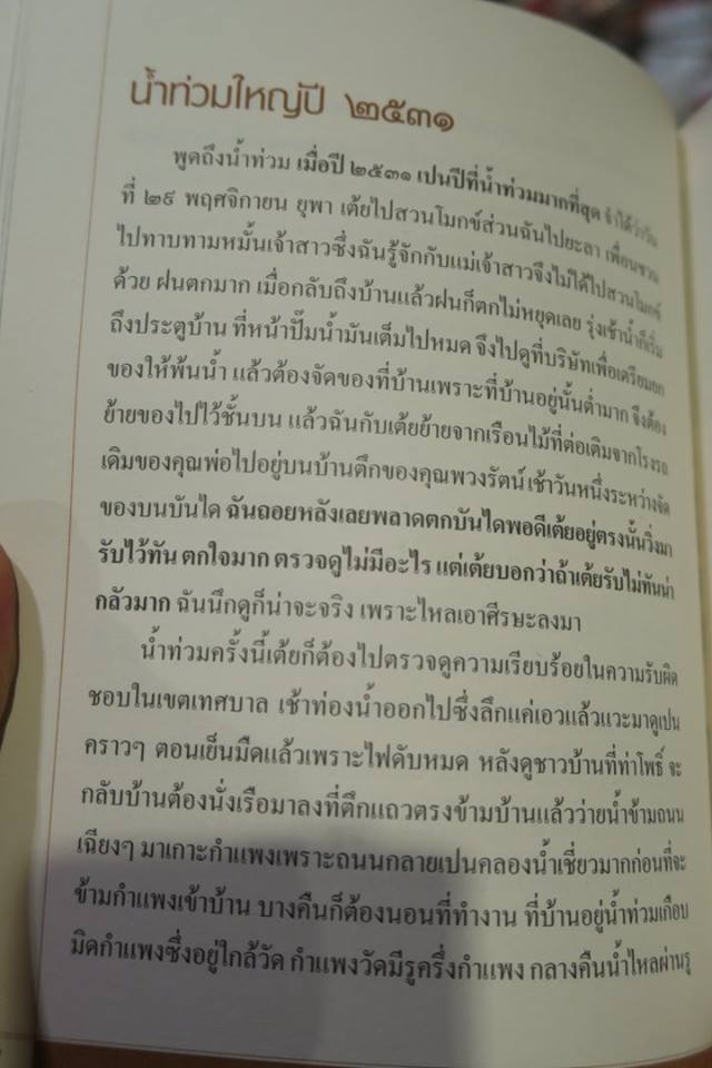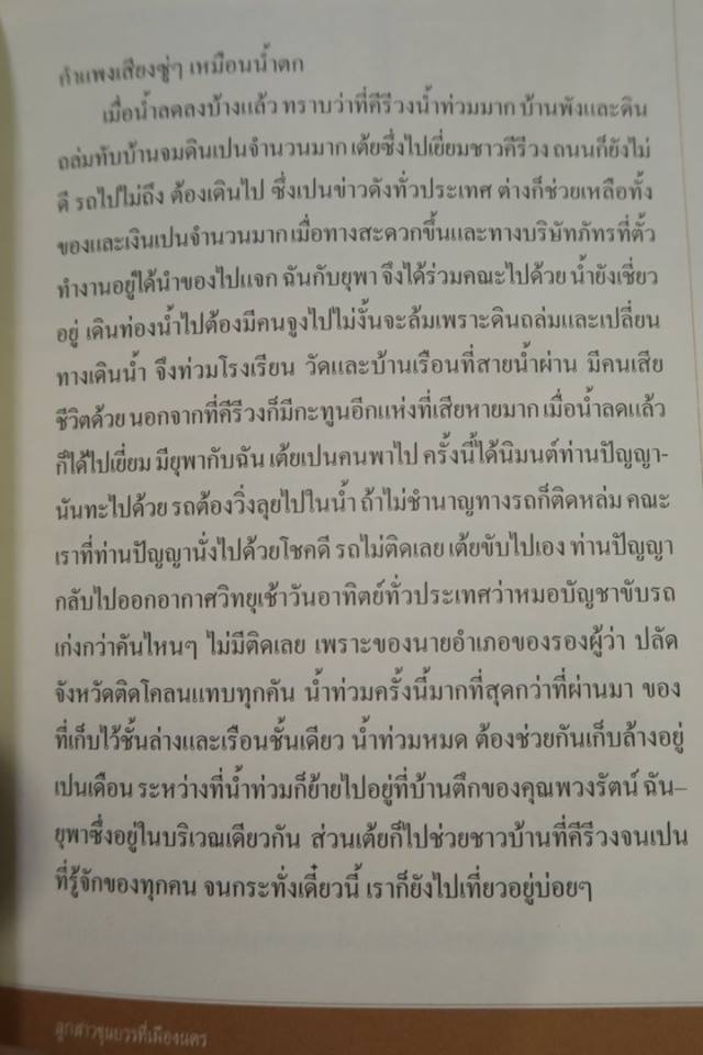 จำได้ว่าแม่เขียนไว้ไม่น้อยถึงน้ำท่วมใน "เรื่องเล่าของแม่" แถมเมื่อตอนปีใหม่ได้อ่านบันทึกเมื่อตอนบวช พบจดหมายของ "โยมแม่" ที่เขียนส่ง "พระลูกชาย" ที่สวนโมกข์ ว่าได้ทำอย่างไรบ้าง