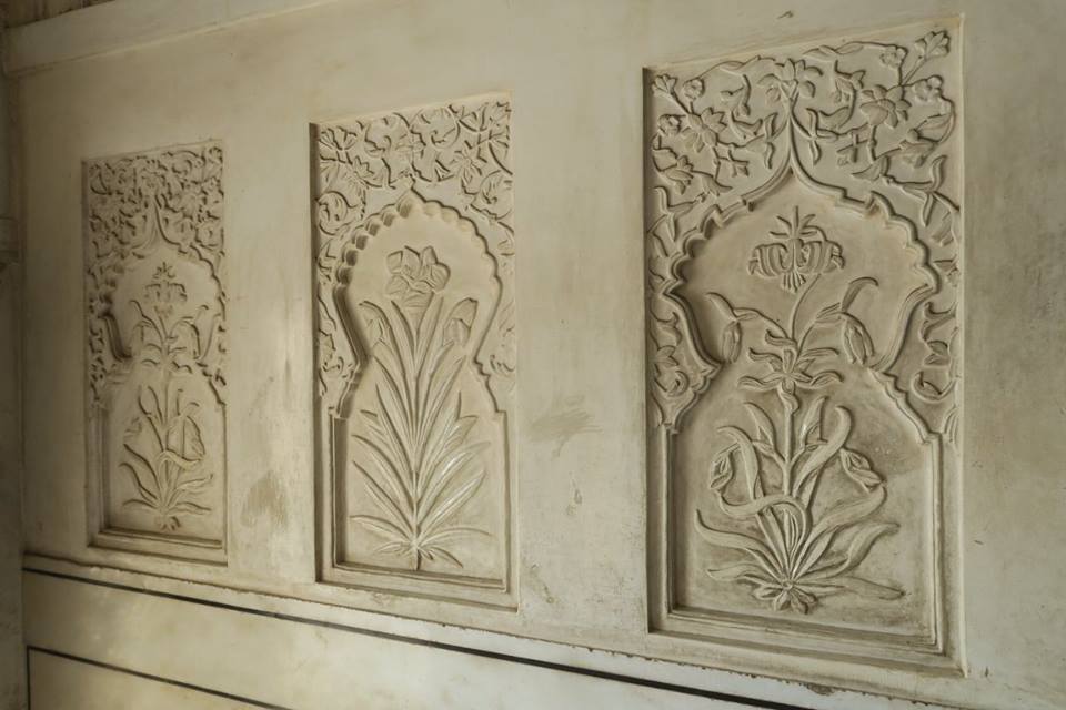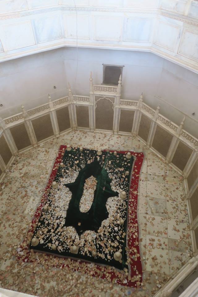 มีขนาดเล็กกว่า เพราะผู้สร้างมิใช่ "ชาห์" แต่ยังรักษาลักษณะสมมาตรไว้พร้อมมัสยิด เสาหอประกาศทั้งสี่ สูงกว่าต้นแบบ ส่วนข้างในใช้หินอ่อนเฉพาะชั้นฐานและบนยอดโดม นอกนั้นเป็นปูนฉาบ ทำรูปและลายไม่ด้อย แต่ก็ได้ไม่เท่า ส่วนที่ทำฝังหินสีนั้นไม่มีเลย ทำได้แต่เพียงแต้มสีวาดไว้เลา ๆ เท่านั้น
