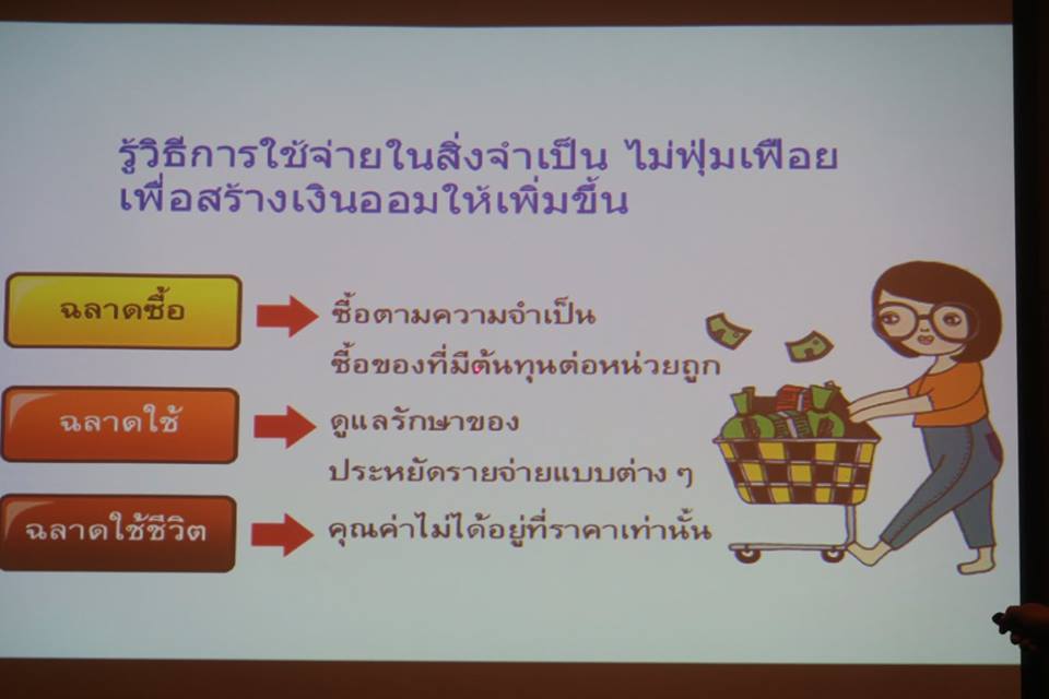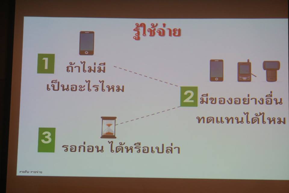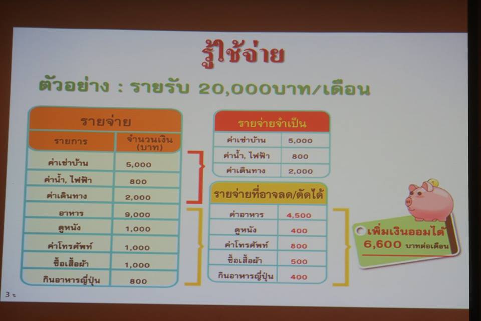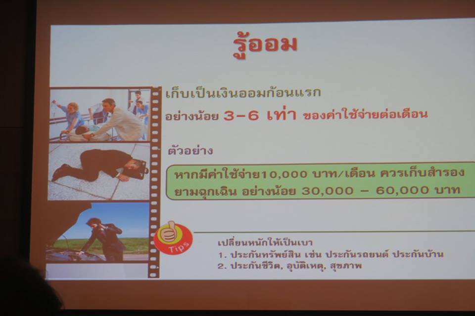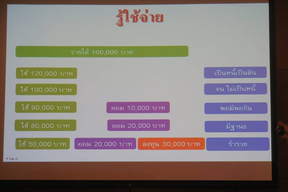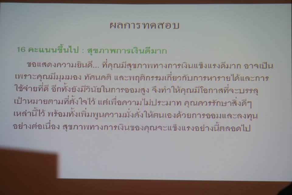 จากนั้นมีการเสนอ SMART GOALS แล้วทดสอบพิสัยทางการเงินการคลังกันด้วยแบบทดสอบ ๑๒ ช้อ ผลออกมา ๓ กลุ่ม คือ อ่อนแอ / ปานกลาง / ดีมาก ซึ่งทั้งหมดเกือบ ๓๐ คน อยู่ในเกณฑ์ดีมากไม่กี่คน จากนั้นจึงต่อด้วยรู้ออม รู้ใช้จ่าย รู้ลงทุน จนจบวันด้วยการทดลองออกแบบกับ ๒ กรณีนำร่อง น้องใหม่มาเริ่มงานอายุ ๒๔ ที่คาดหวังว่าจะอยู่ถึง ๘๐ ปี แต่แผ่นการออมและใช้สามารถสำรองใช้ได้เพียง ๗๒ ปีหมด กับอีกคู่สมรสวัย ๔๐ ที่คาดว่าจะอยู่ถึง ๘๐ ปรับแผนไปมาลงเอยที่ตายแล้วยังเหลือเงินพินัยกรรม-ทำศพอีก ๑ ล้านบาท