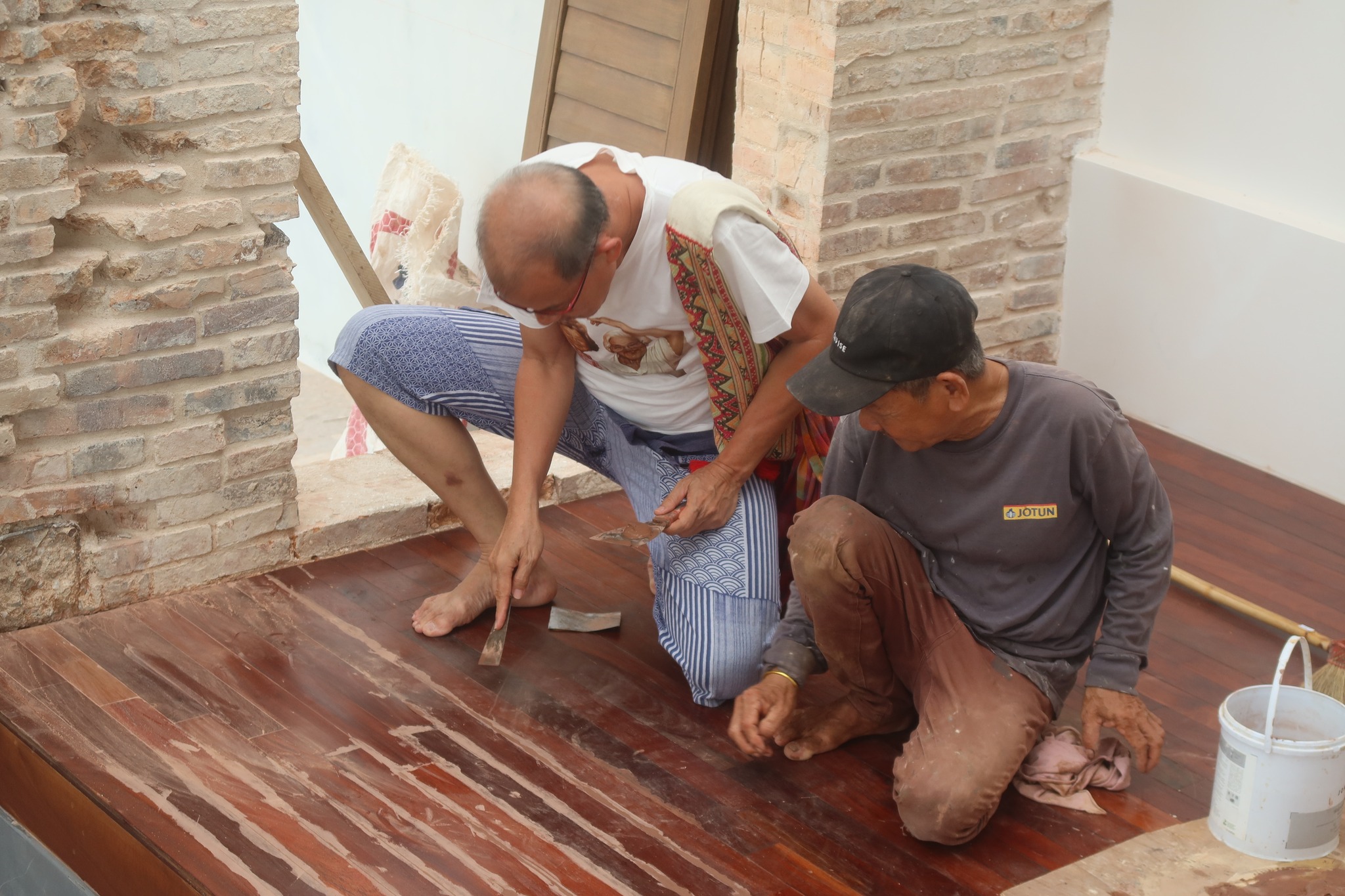 พอดีพี่ปีเตอร์กำลังโป๊วพื้นไม้แดงอยู่ ก็เลยเอาบ้าง ๕๕๕