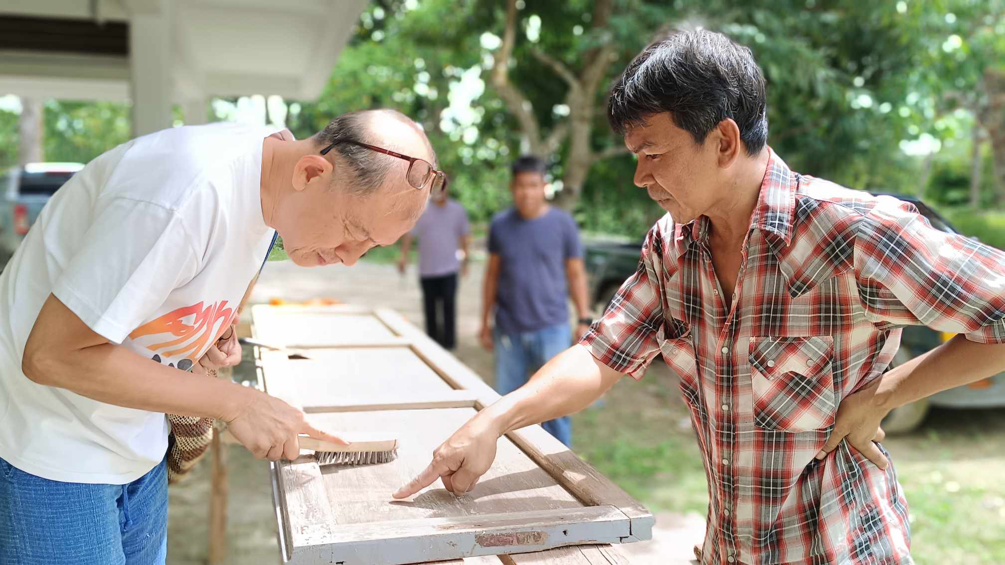 พี่น้องตามไปดูไม้ เพื่อเอามาติดตั้งบานประตูเรือน