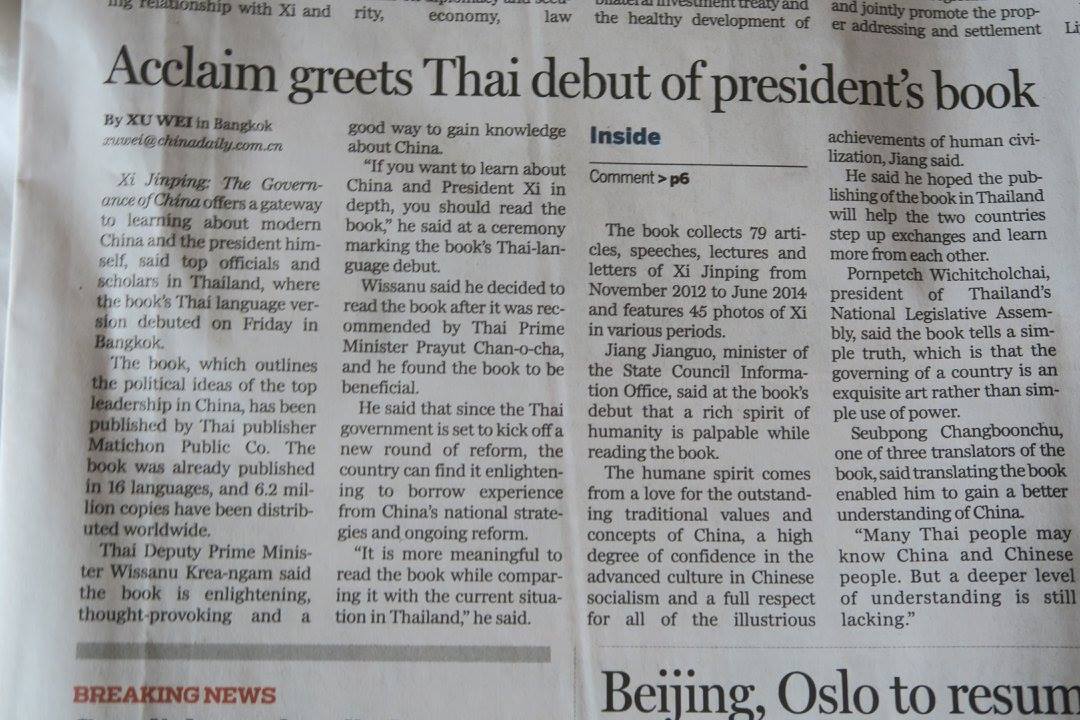 China Daily ลงข่าวการเปิดตัวหนังสือแปลงานของประธานาธิบดีจีน สี จิ้ง ผิง โดย สนพ.มติชน ประกบกับข่าวที่บอกว่า "มีเหตุเป็นพัน ๆ ที่จะต้องสร้างสานสัมพันธ์กันไว้"