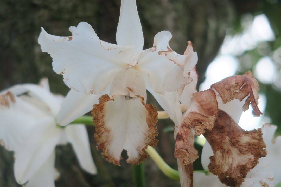 แคทลียาดอกขาวสะอ้านสวยที่เกาะต้นมังคุดอยู่ ๒ กอ กำลังบานเต็มที่ และภีมก็น่าจะได้ชมและดมด้วยแล้วเมื่อไม่กี่วันนี้ มีบางดอกเหี่ยวรอร่วงตาม ๆ กันไปไม่ต่างจากภีม