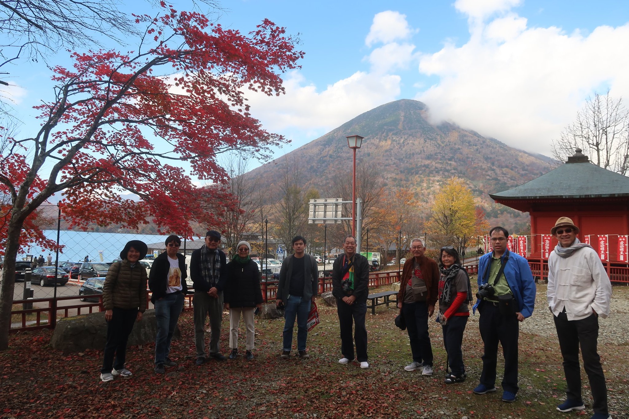 ในวัดที่ริมทะเลสาปชูเซ็นจิ ตรงใต้ต้นเมเปิ้ลแดงแช๊ดนั้นหากหามุมดี ๆ จะเห็นยอดเขานันไตอันศักดิ์สิทธิ์ได้ด้วยขณะที่ผมพยามต้อนพี่น้องให้เข้ากรอบภาพและกดได้เพียงภาพเดียวก็มีเจ้าหน้าที่วัดมาอาสาถ่ายให้เลื่อนพวกเราลงมาใต้ฐานเขาไปนิดนึงขณะที่ภาพแกที่ผมตั้งถ่าย ลูกเขาก็ตำลงมานิดหนึ่งเห็นใบไม้บนพื้นสวยไปอีกอย่างได้มาประมาณนี้ครับ