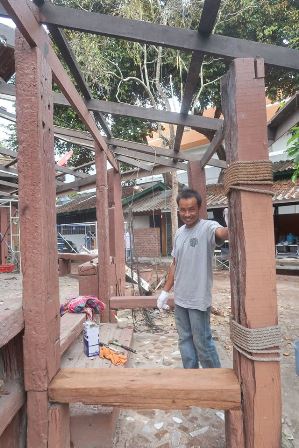 ตอนเช้า ถูกตามไปดูการลอกสีไม้หมอนที่ "มัดไม้-หมากปาล์ม"