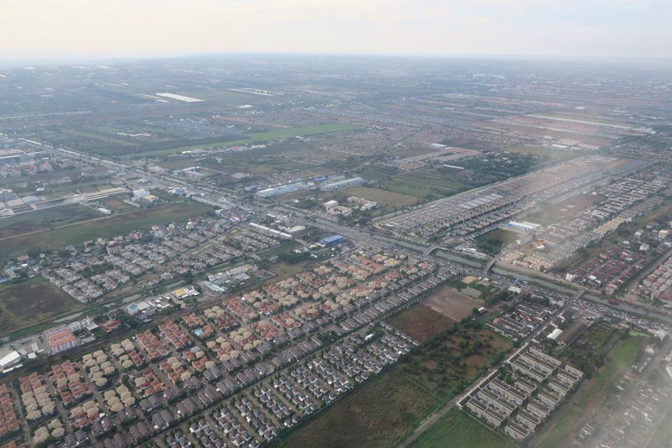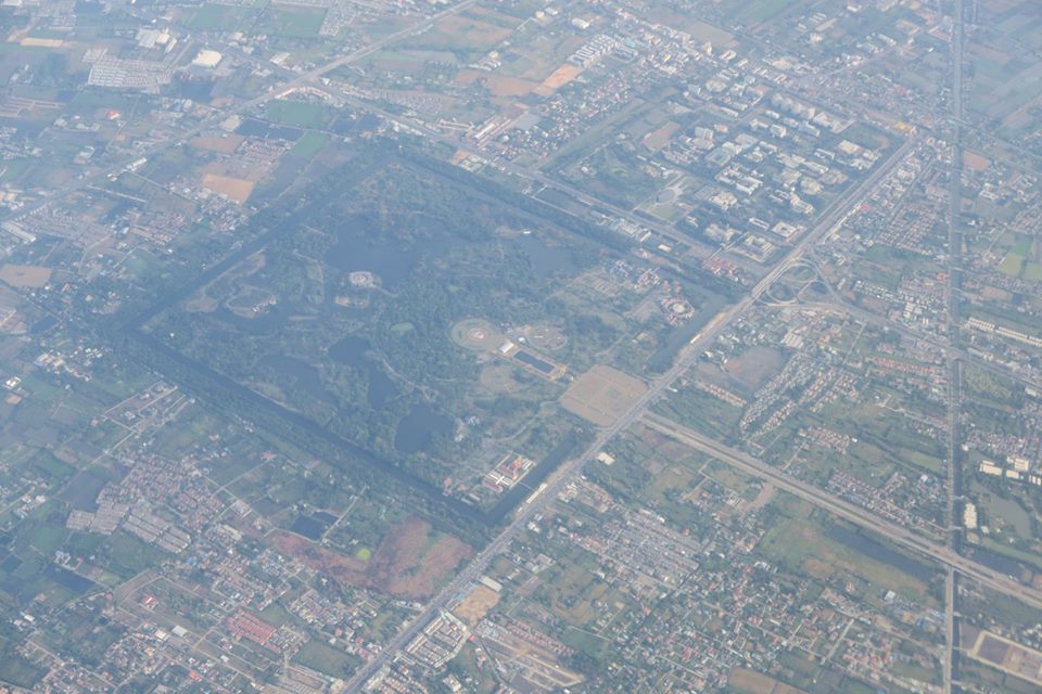เครื่องบินเลียบน้ำท่าจีนที่คดเคี้ยวขึ้นไปเรื่อย ๆ ยังกะจะไปให้ถึงจินหลินที่ถูกฟูนันตีเป็นที่สุดท้าย แล้วเครื่องก็เลี้ยวให้ดูพุทธมณฑลเต็ม ๆ โดยไม่เห็นพระปฐมเจดีย์ รวมทั้งจานบินธรรมกาย แต่เห็นสถานีรถไฟฟ้าบางบัวทองกับ ๒ ห้างยักษ์ที่มาตั้งขายวัสดุก่อสร้างกลางทุ่ง ก่อนที่จะข้ามโค้งเจ้าพระยา มาข้ามหลายสายถนนและทางรถไฟ สู่วิภาวดีรังสิต ทุ่งและคลองรังสิตที่เต็มไปด้วยบ้านและรถกำลังติดต่อเนื่องมาจากฝนตกหนัก