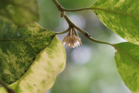 เพิ่งพบว่าช่วงนี้ พิกุลใบด่างต้นที่เอามาปลูกไว้ในบ้านแม่กำลังให้ดอก