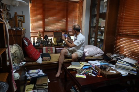 ตรงหลังโต๊ะทำงาน มีหลังสื่อช้าง ๆ กับบางรูปภาพ