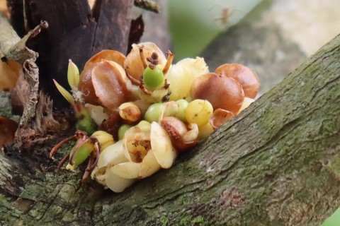 แต่ออกดอกเป็นชุกตามกิ่ง ต่างจากมังคุดที่ออกตรงปลายยอด
