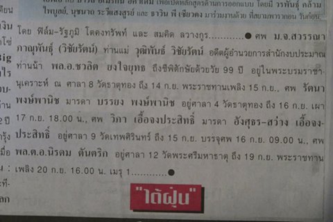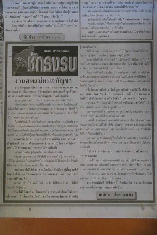 พี่ประกิต-กิเลน ก็มากับผู้สื่อข่าวนิเกอิของญี่ปุ่น บอกว่าอยากเขียนอะไรให้งานแม่จะได้ไหม ผมบอกว่าหากเป็นเรื่องส่วนตัวก็อย่าเลย แต่หากเห็นเป็นประโยชน์สาธารณะและพระศาสนา ก็ตามที่พี่จะเห็นควร พร้อมกับบอกว่า พวกเราหารือกันว่าหากจะให้งานแม่ เป็นกรณีศึกษาการทดลองพัฒนาและสาธิตงานศพที่เหมาะสมทั้งทางโลกและทางธรรม ตามประเพณีนิยมและสมคุณค่าก็ได้ เราก็ทำกันตามกำลังและศรัทธา โดยมีพ่อแม่ครูบาอาจาร์และกัลยาณมิตรมาช่วยกันคนละไม้คนละมือ โดยวันนั้นหนังสือแจกเป็นชุดธรรมะที่เมืองนคร ๓ เล่ม คือ ธรรมะช่วยได้ กับ การส่งเสริมการปฏิบัติธรรม ของท่าน อ.พุทธทาส และ อยู่ด้วยปัญญา ของท่าน อ.ปัญญานันทะ